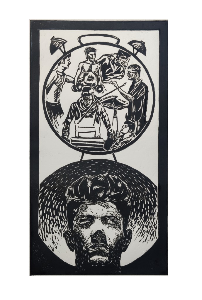 Uday Panchal, ‘Fragmented Time’, woodcut, 12” x 15”