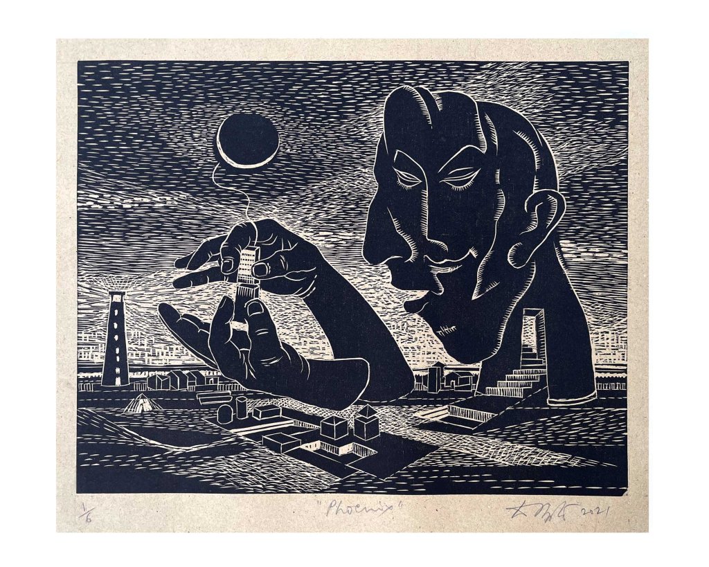 Dattatreya Apte, ‘Pheonix’, woodcut, 12” x 15”