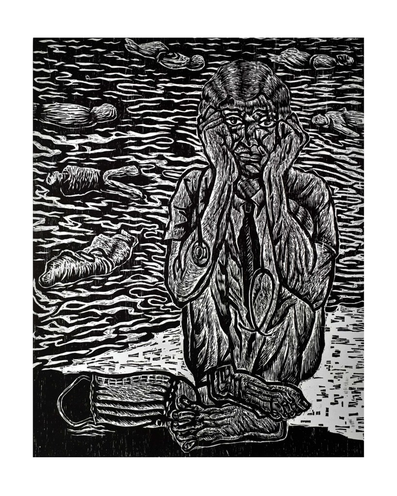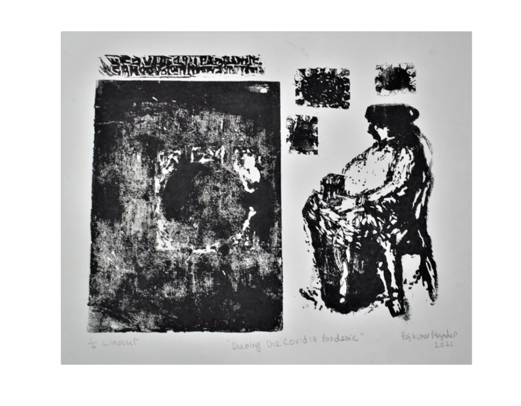 Dr. Raj Kumar Mazinder, ‘During the Covid-19 Pandamic’, linocut, 12” x 15”
