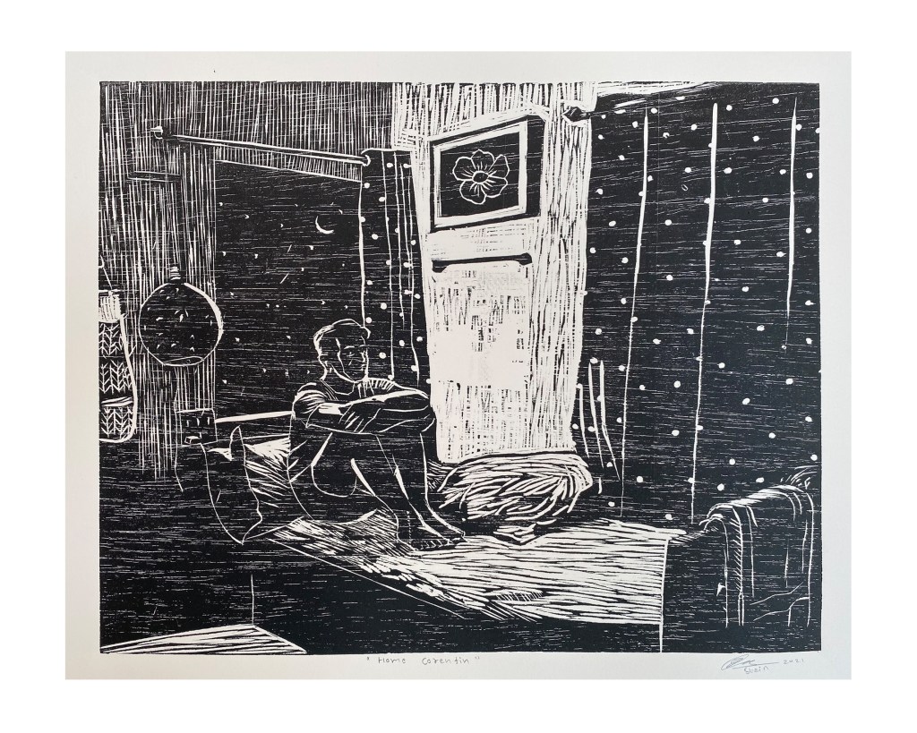 Dushyant Patel, ‘Home Quarentine’, woodcut, 12” x 15”
