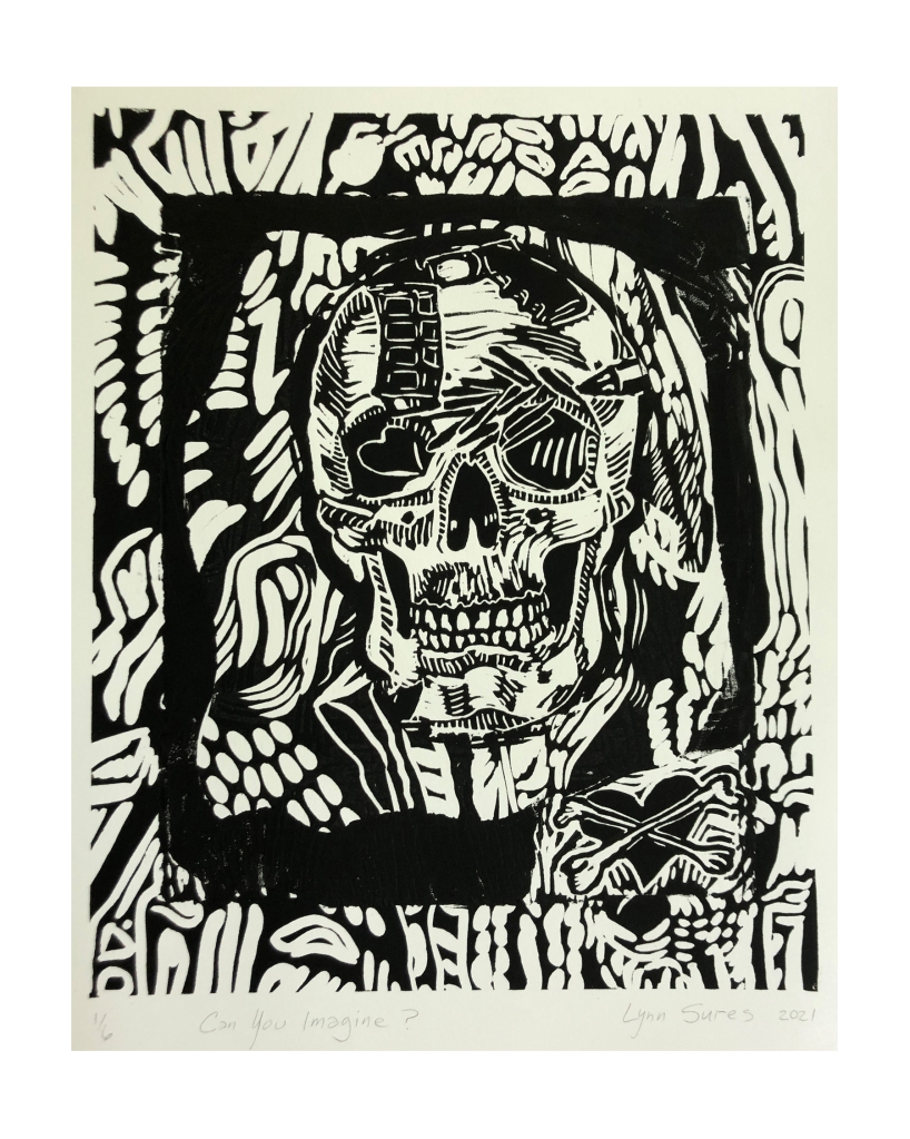 Lynn Sures, ‘Can you Imagine?’, linocut, 12” x 15”