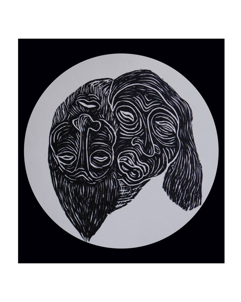 This black and white woodcut print conveys the underlying emotion of rejection of life’s monotony, whilst still living in a closed societal circle. Living in an organised framework as in a society, we tend to live our lives bound under unspoken rules. Only a few are able to break out from these systemic ties. In this print, we see the victim tied into this circle of life and yet striving to expand and broaden the circle. But alas, he ends up only expanding the cyclical dark inner void.