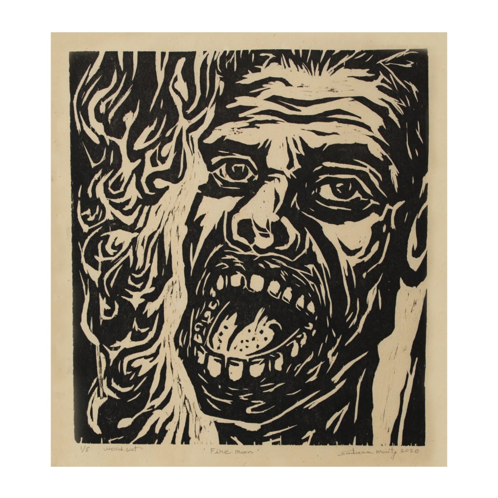 Santanu Maity, ‘Fire Man’, woodcut, 12” x 12”
