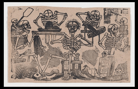 President Porfirio Diaz Mori ascended to power in the mid-19th century by deposing the French ruler, Emperor Maximilian. Díaz was keen on developing Mexico into an industrial economy. He allocated land belonging to the underprivileged to overseas investors for industrial construction. Against this backdrop, artists Gabriel Vicente Gahona (1828-1899) and José Guadalupe Posada (1852-1913) produced black and white relief prints, ludicrously lampooning the bourgeoisie and the newly enacted laws of Díaz. They rejected the traditional norms of editioning, instead mass-producing their compositions on cheap newsprint paper to be distributed countrywide, including Posada’sfamous ‘Calaveras’ series. The Calaveras or skull, an important symbol in ancient Mexican culture, is associated with the Day of the Death ritual. It celebrates mortality that is inescapable and encourages one to greet Death as a friend. Posada re-contextualised this iconic symbol to express the political and social crisis of his time. Posada’s broadsheet prints became extremely popular among the common people, instilling revolutionary zeal in the illiterate Mexican people.