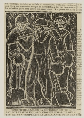 The Partido Comunista Mexicano or PCM, was founded in the mid-20th century to uphold workers’ rights. PCM facilitated printmaking to aid education and underline the proletariat’s rights. Especially black and white relief printmaking became their tool to propagate socialist ideology amongst the working classes. Many artist groups were formed – SOTPE, LEAR, TGP were prominent amongst them. Woodcut and linocut became their medium for mass reproduction of posters, single-sheet prints, print suites, and illustrated publications. Artist Xavier Guerrero, a member of the SOTPE group executed a black and white woodcut titled ‘Oil Refinery Workers’, published in El Machete in 1924. The artist delineated the three refinery workers in crisp white gouging against a black background, highlighting the suffocating ambiance beneath the refinery. The workers were wielding their tools as if they were weapons, signifying the revolutionary ideology of the Communists. Artist Leopoldo Mendez belonged to the TGP group. He was a linocut artist, proficient in implementing a variety of middle tones in black and white linocut.