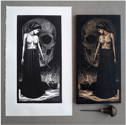 Even today, the Latin American legacy of black and white relief printing follows the same role it has had since inception, catalysing social and political awareness in the masses. Contemporary Latin American printmakers conceive their work as a beautiful fusion of native history and modern surroundings, portrayed in narrative forms that remind us of graphic novels, posters and graffiti. Brazilian printmaker Ramon Rodrigues was born in 1982. He specialises in small scale wood engraving, printed in stark black and white contrast. His works illustrate the supernatural and death in the terrestrial world. Ramon initiates a mobile woodcut studio project to facilitate interaction between common people and printmaking. He also designs music album cover pages and bottle labels in woodcut.