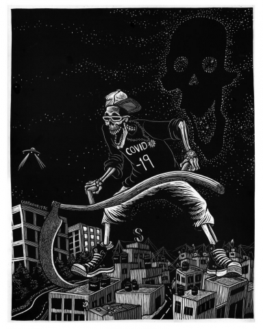Sergio Sanchez Santamaria, a Mexican-born printmaker, reinterprets the ideals of Mexican graphic art in today’s social and political context. He brings the traditional back to life, juxtaposing iconography with elements from the modern scenario. As mentioned earlier, death is an important moment in Mexican culture. Sergio’s woodcut ‘Covid19’ reimagines death in a more contemporary light. Death appears in his print as a rapper from the 21st century. He is laughing at the spectator, dressed in three-quarter slacks, sneakers, a peak cap, and cool sunglasses, while wielding a traditional scythe. In the background, a smiling skull rises in the sky, surrounded by stars, as in the Harry Potter movies, signifying the horrifying realities of Covid-19 across the world.