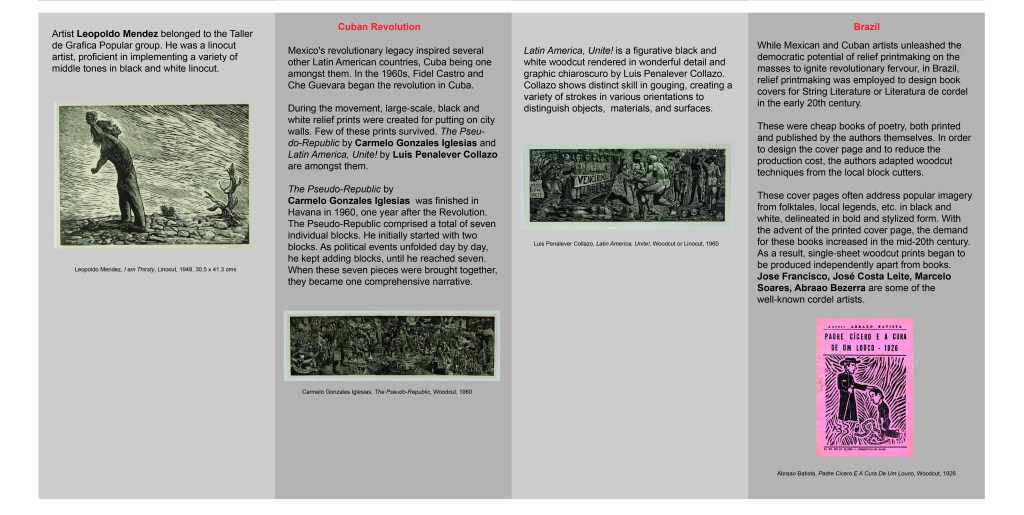 Mexico’s revolutionary legacy inspired several other Latin American countries, Cuba being one amongst them. Che Guevara and Fidel Castro first met in Mexico City in 1955. They ultimately succeeded in taking over Cuba’s administrative power from Fulgencio Batista in 1960. During the movement, large-scale, black and white relief prints were created for putting on city walls. Few of these prints survived. ‘The Pseudo-Republic’ and ‘Revolution’ by Carmelo Gonzales Iglesias and ‘Latin America, Unite!’ by Luis Penalever Collazo are amongst them.These aremonumental black and white woodcuts, depicting Cuba’s revolutionary history. ‘The Pseudo-Republic’ by Iglesias was finished in Havana in 1960, one year after the Revolution. ‘The Pseudo-Republic’ comprised a total of seven individual blocks. Iglesias initially started with two blocks. As political events unfolded day by day, he kept adding blocks, until he reached seven. When these seven pieces were brought together, they became one comprehensive narrative. Both Iglesias and Collazo’s works are figurative, rendered in wonderful detail and graphic chiaroscuro. Collazo shows distinct skill in gouging, creating a variety of strokes in various orientations to distinguish objects, materials, and surfaces.