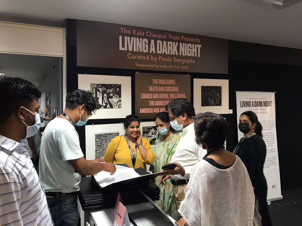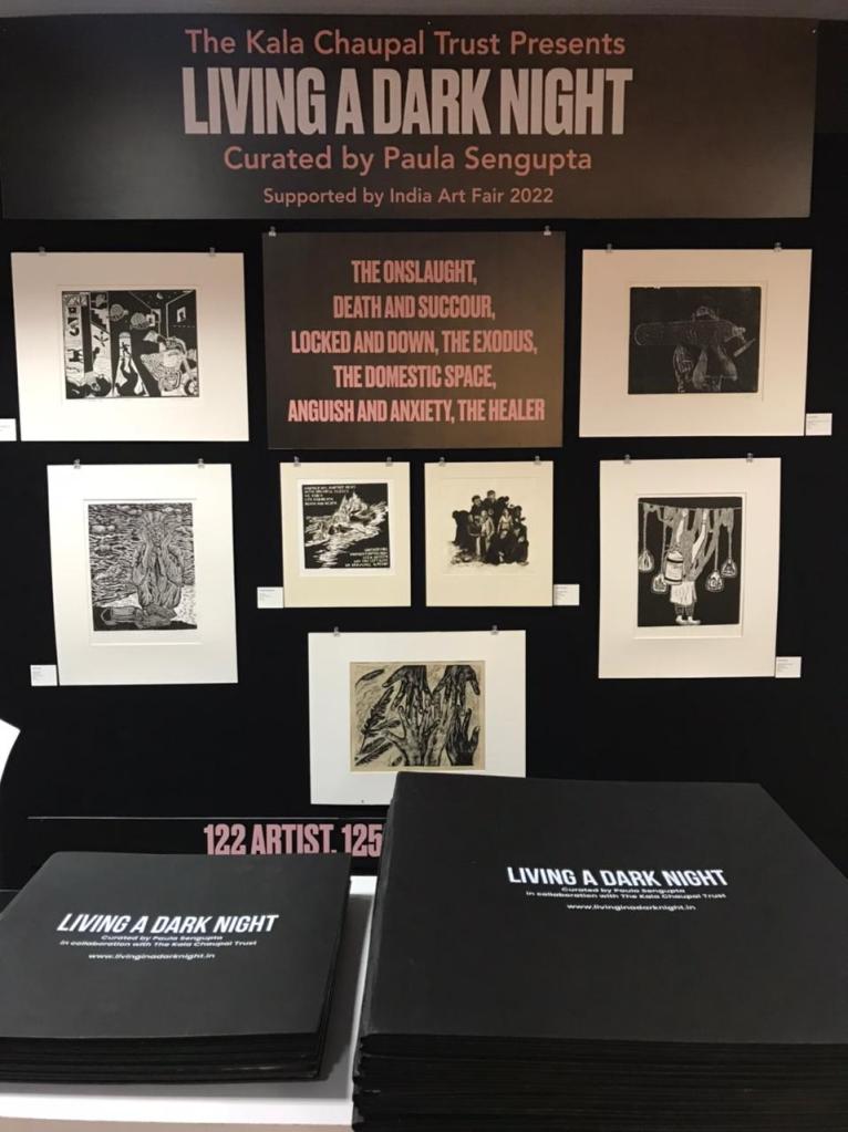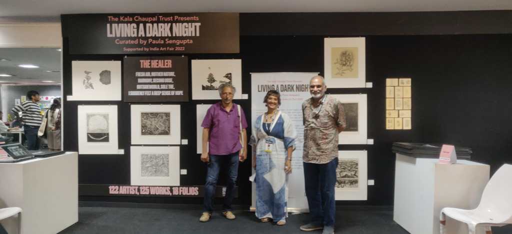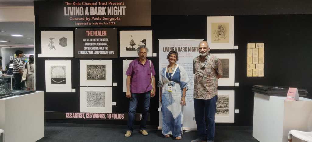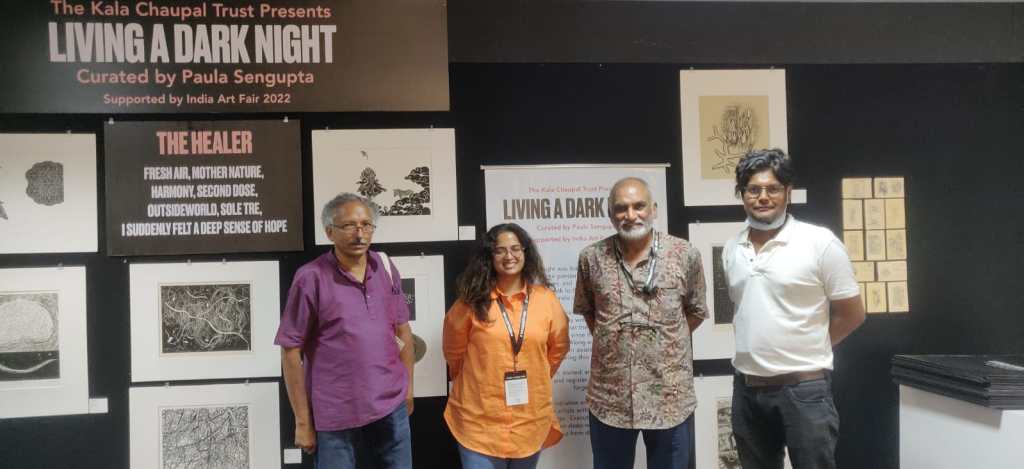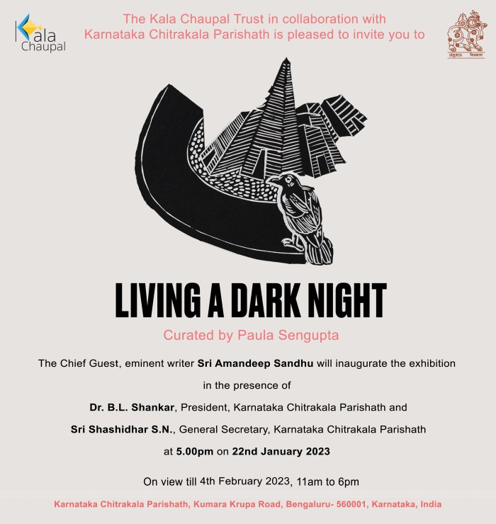KCC also organised a virtual talk session, ‘Living A Dark Night… In Continuum’ as part of the AMI Arts Festival on 19th December 2022. LADN artists Nandini Chirimar, Kavita Shah, Srikanta Paul, Nilanjan Das, Avni Bansal, and Pathik Sahoo were invited as panellists and shared their experiences of how LADN triggered them to develop a significant body of work and the role of printmaking in the public sphere. The session was moderated by the LADN curator, Dr. Paula Sengupta.
