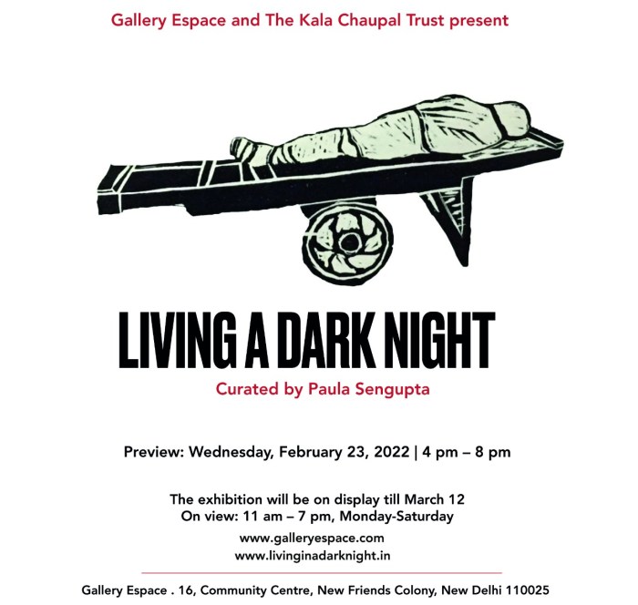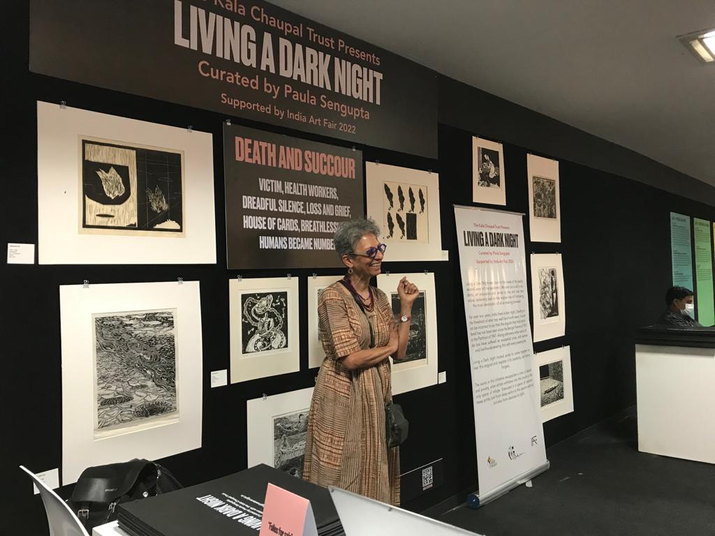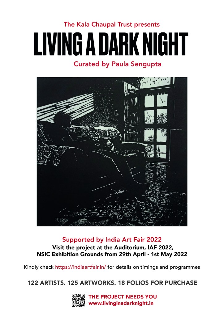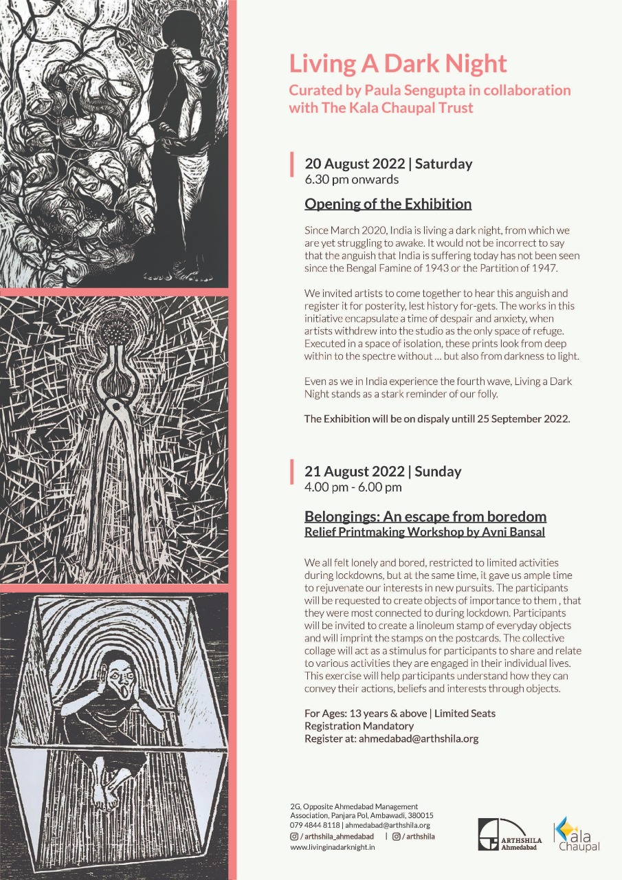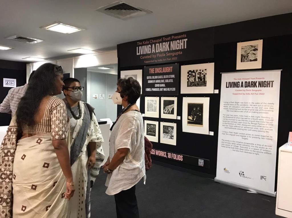 KCC also organised a virtual talk session, ‘Living A Dark Night… In Continuum’ as part of the AMI Arts Festival on 19th December 2022. LADN artists Nandini Chirimar, Kavita Shah, Srikanta Paul, Nilanjan Das, Avni Bansal, and Pathik Sahoo were invited as panellists and shared their experiences of how LADN triggered them to develop a significant body of work and the role of printmaking in the public sphere. The session was moderated by the LADN curator, Dr. Paula Sengupta.