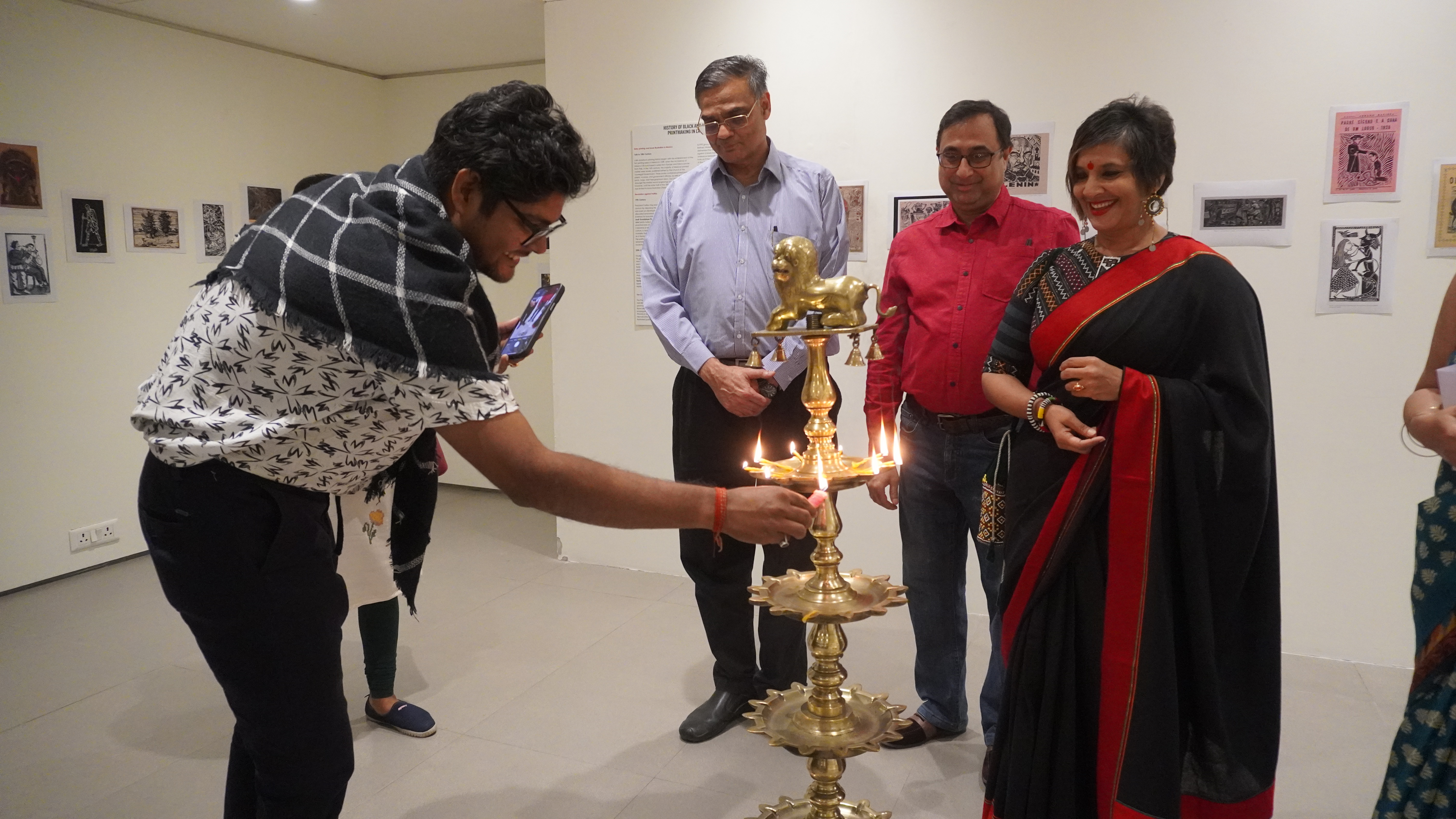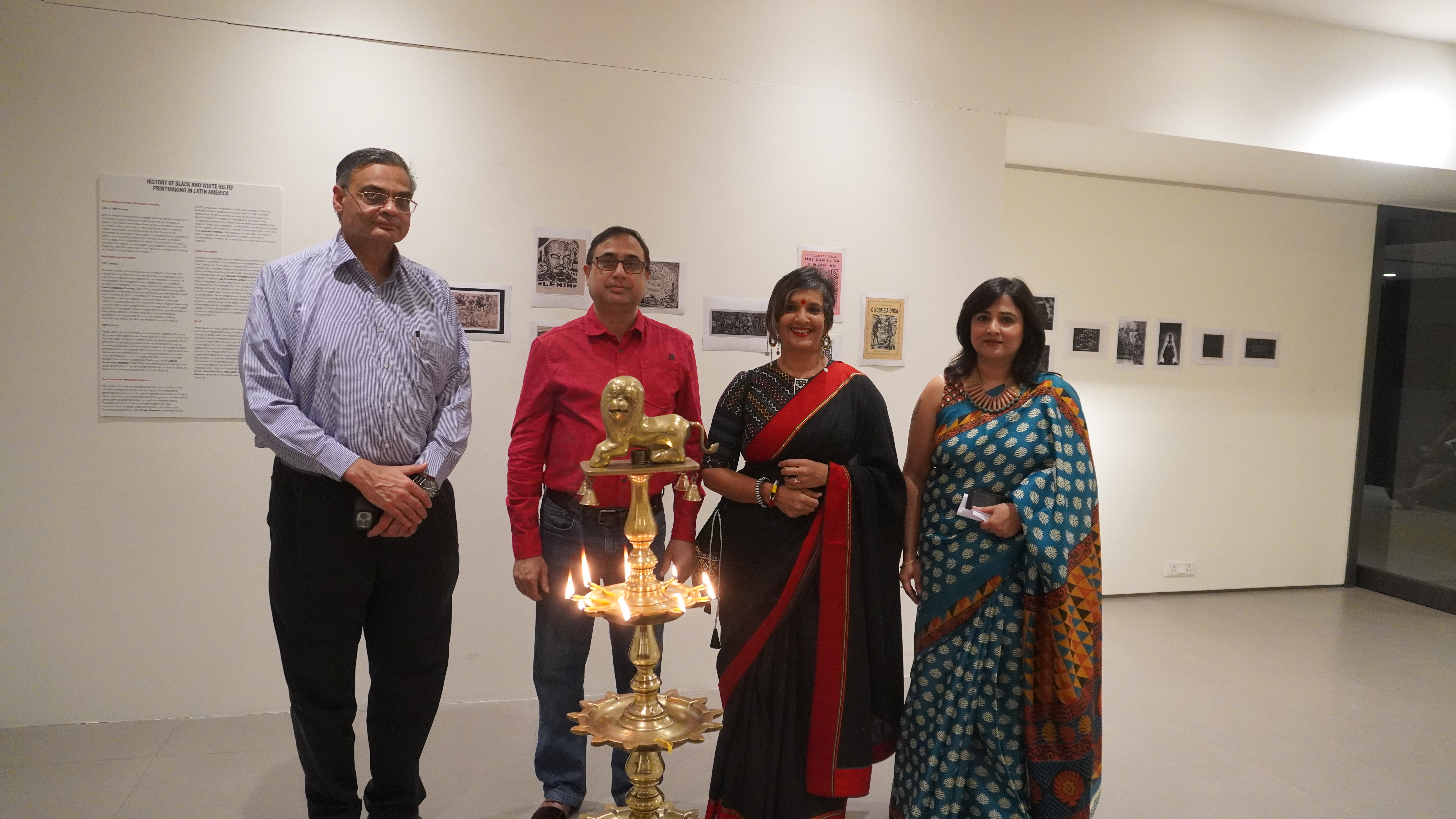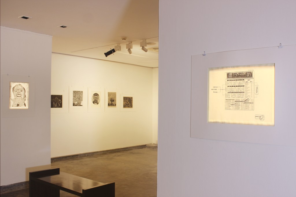 The sixth iteration of LADN opened at the Kolkata Centre for Creativity on 3rd December 2022 as part of the AMI Arts Festival. We were able to present the entire project for the first time. In the entrance foyer, we displayed illustrated timelines of the global history of black and white relief printmaking, along with workshop outcomes from previous iterations. The exhibition prints were displayed inside the gallery space. The exhibition was inaugurated in the presence of Reena Dewan, Director of the KCC; Rakesh Sahni, Director of Gallery Rasa, Kolkata; and renowned neurosurgeon Dr. Sandip Chatterjee. The exhibition drew a large number of printmakers and artists from Kolkata, as well as students and alumni from Rabindra Bharati University’s Faculty of Visual Arts.