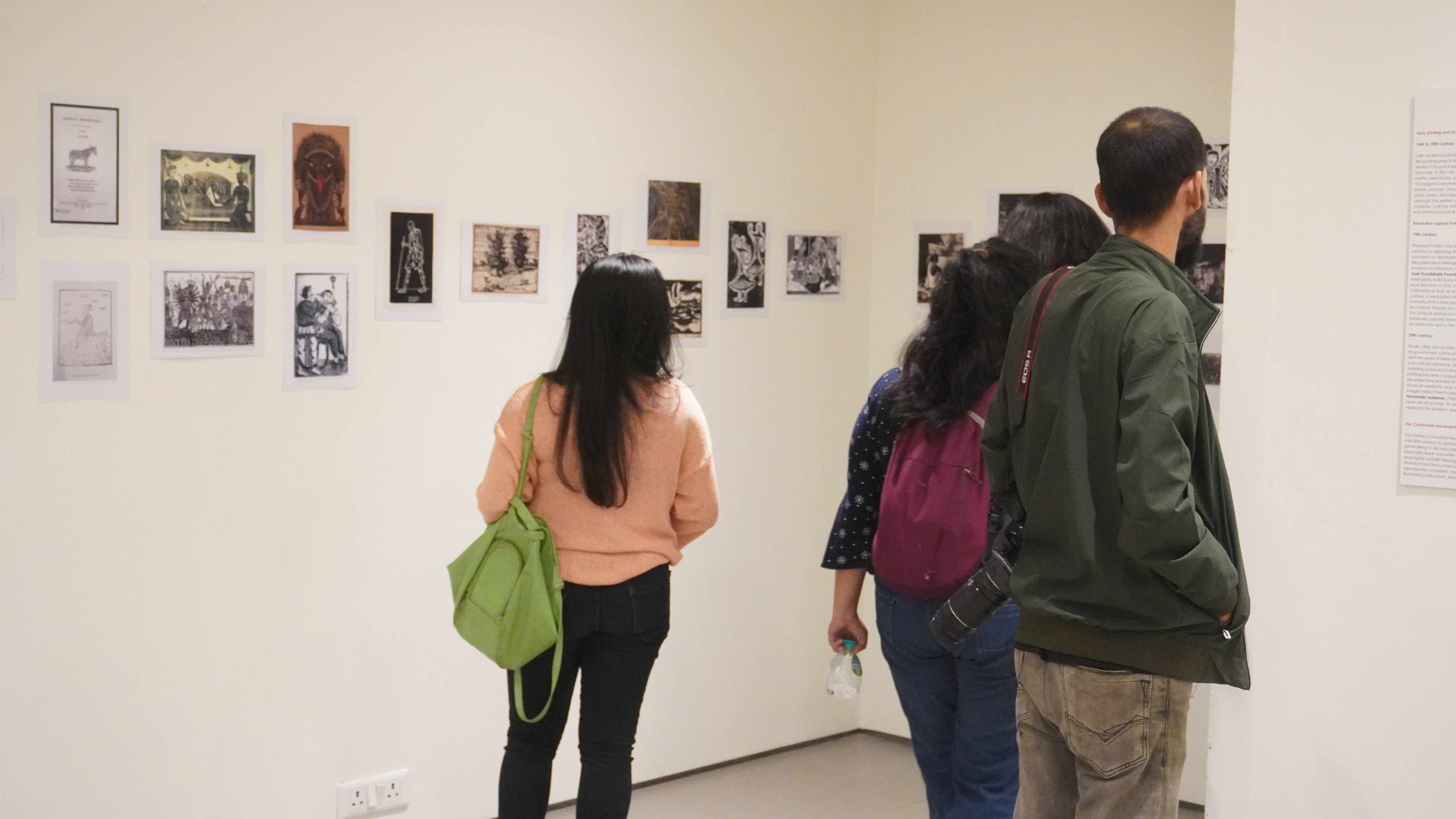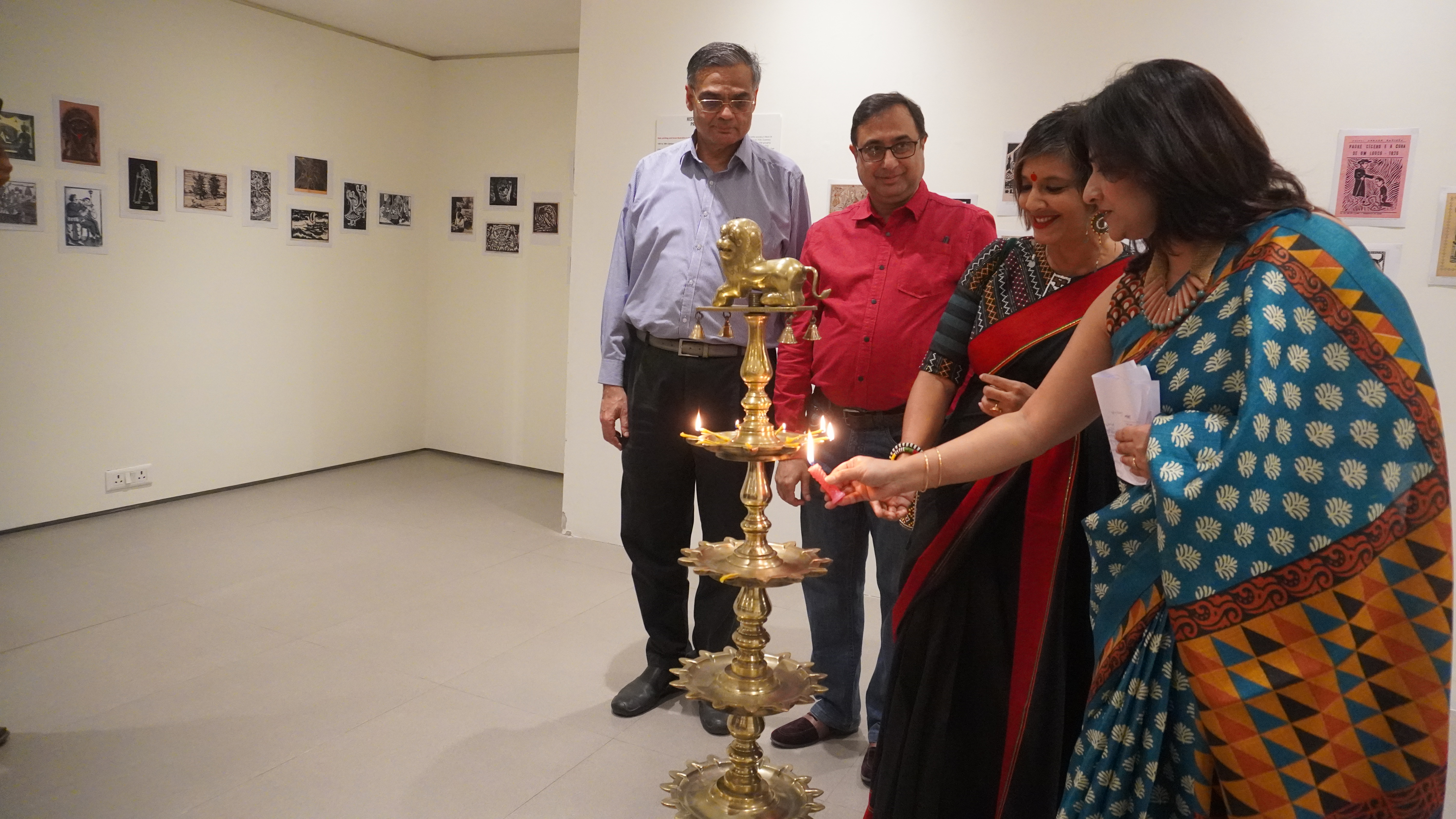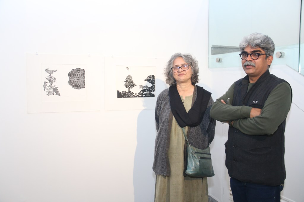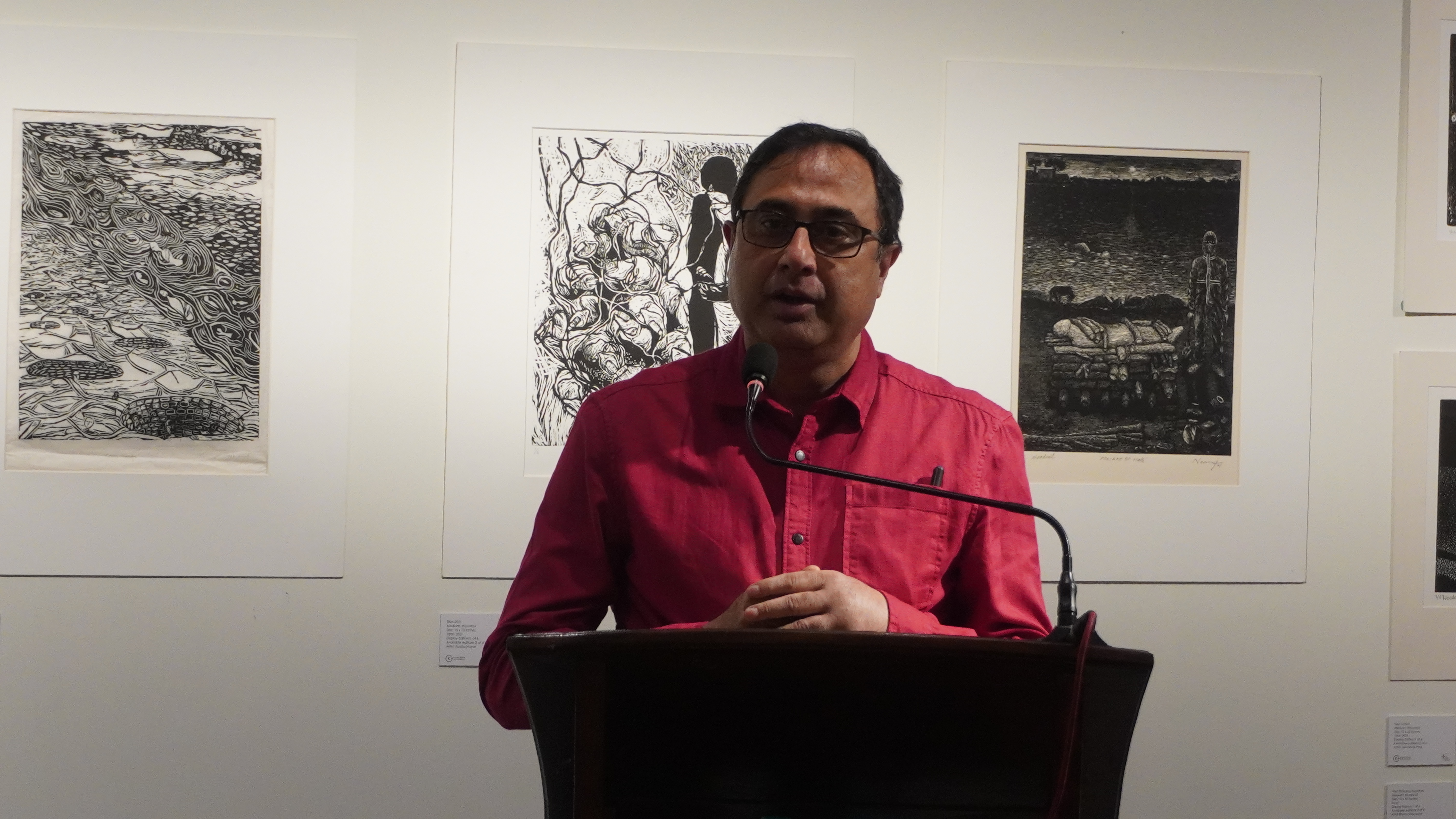 The sixth iteration of LADN opened at the Kolkata Centre for Creativity on 3rd December 2022 as part of the AMI Arts Festival. We were able to present the entire project for the first time. In the entrance foyer, we displayed illustrated timelines of the global history of black and white relief printmaking, along with workshop outcomes from previous iterations. The exhibition prints were displayed inside the gallery space. The exhibition was inaugurated in the presence of Reena Dewan, Director of the KCC; Rakesh Sahni, Director of Gallery Rasa, Kolkata; and renowned neurosurgeon Dr. Sandip Chatterjee. The exhibition drew a large number of printmakers and artists from Kolkata, as well as students and alumni from Rabindra Bharati University’s Faculty of Visual Arts.