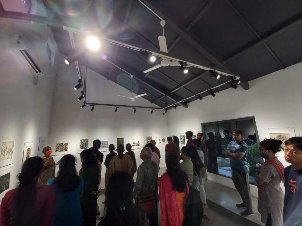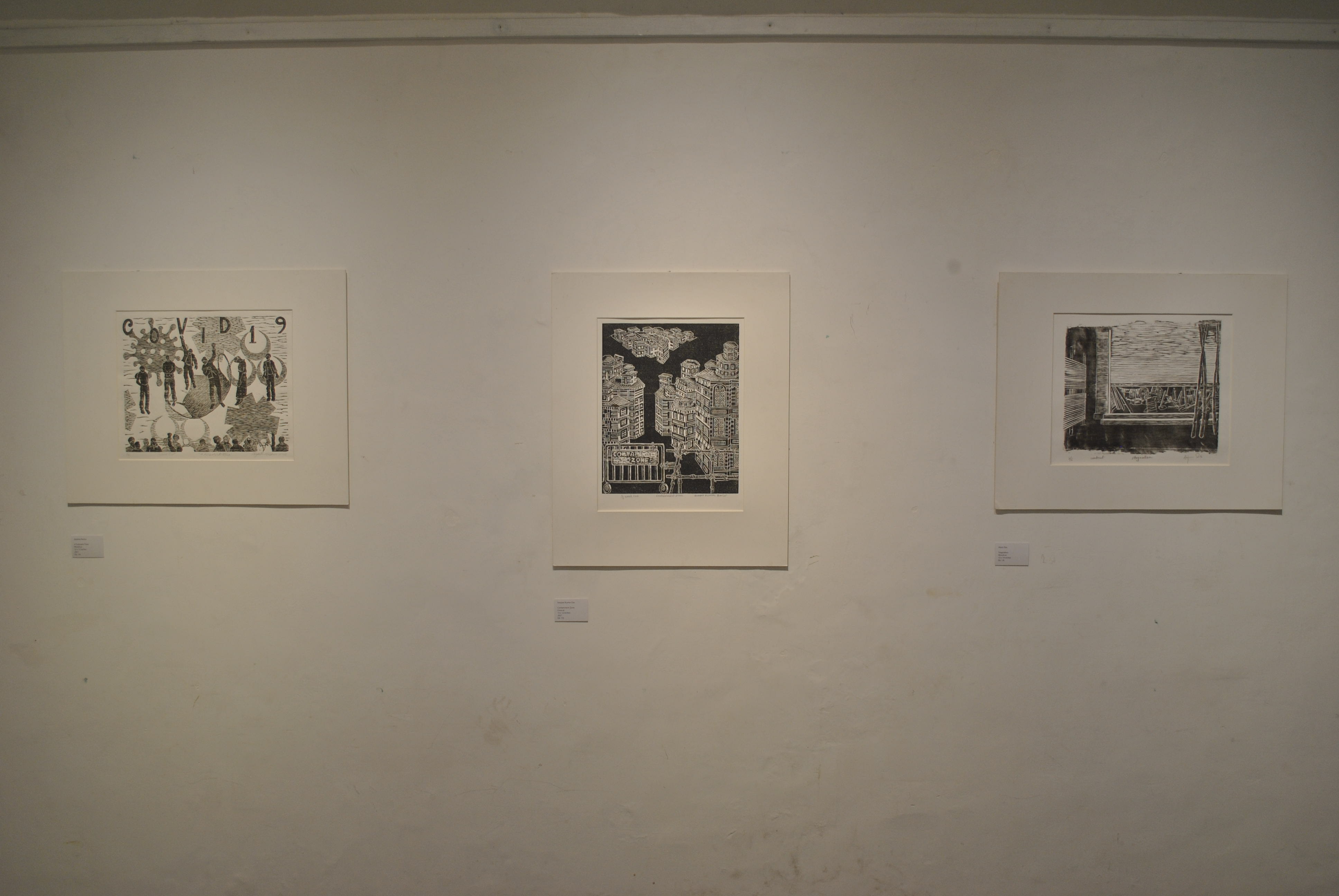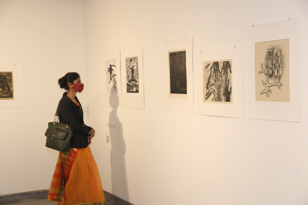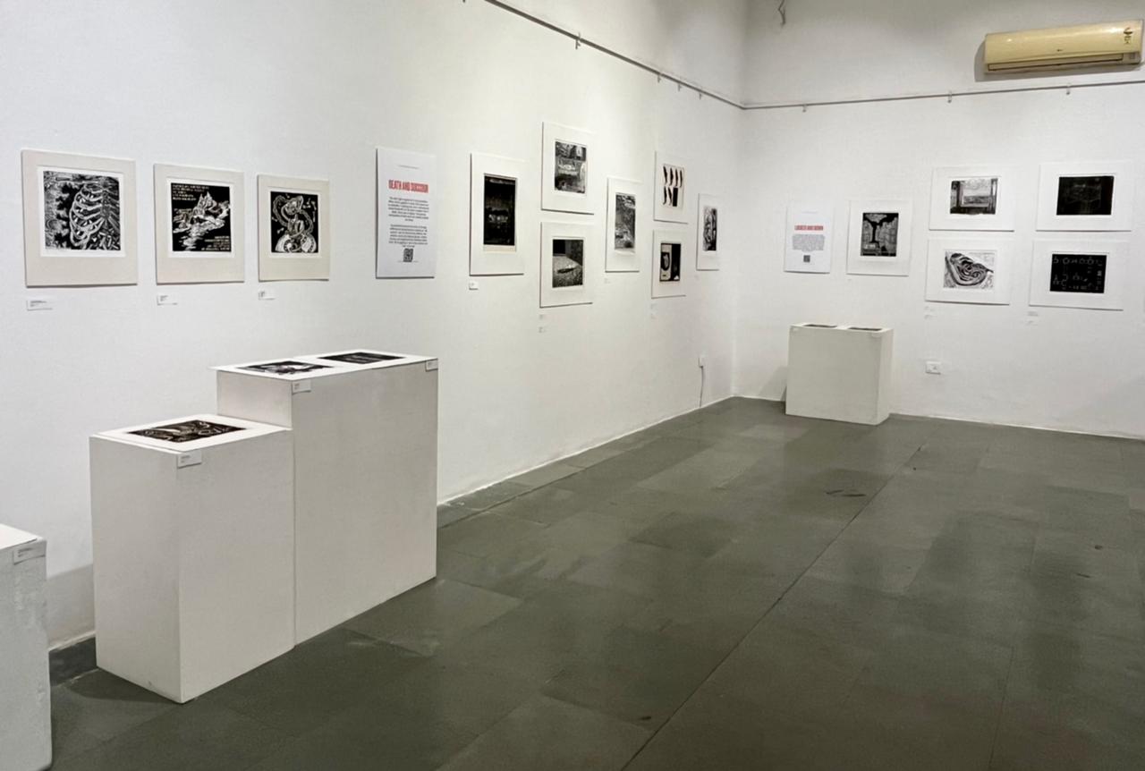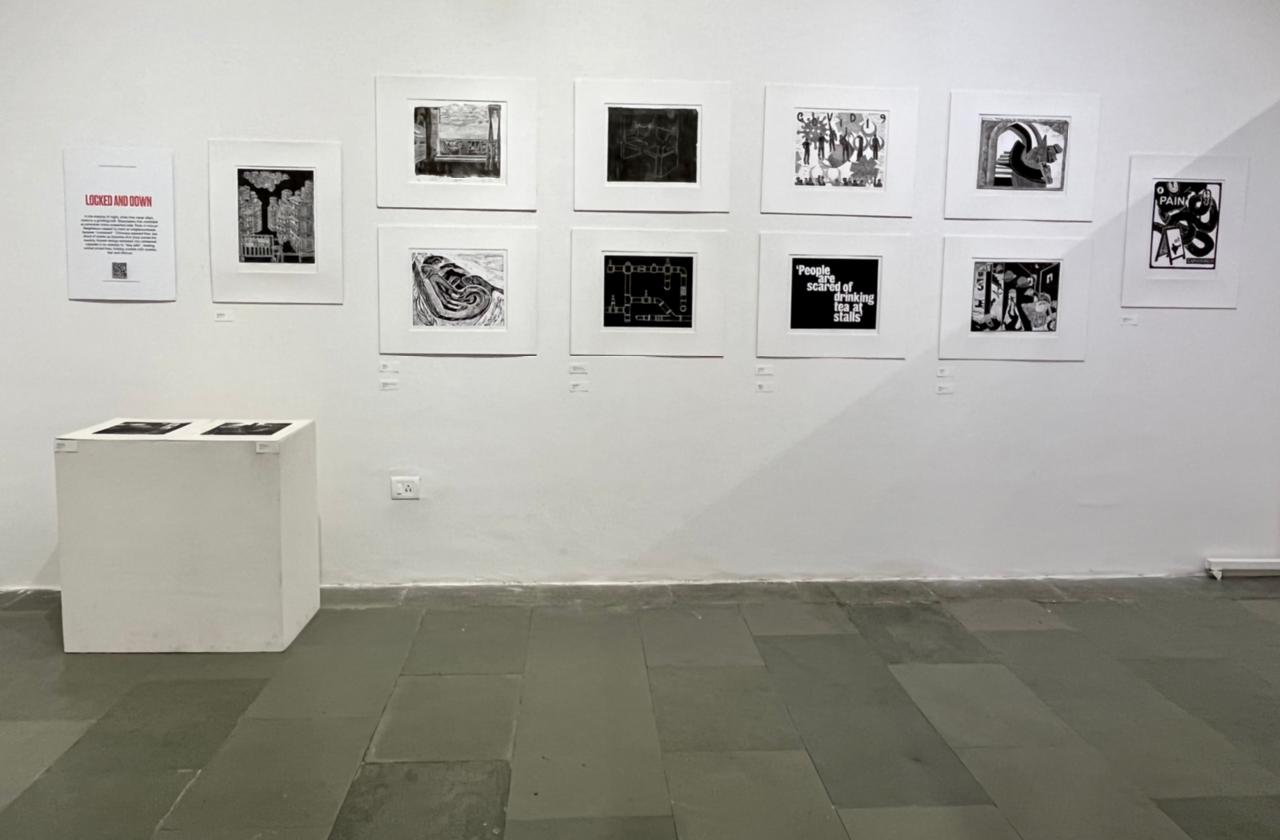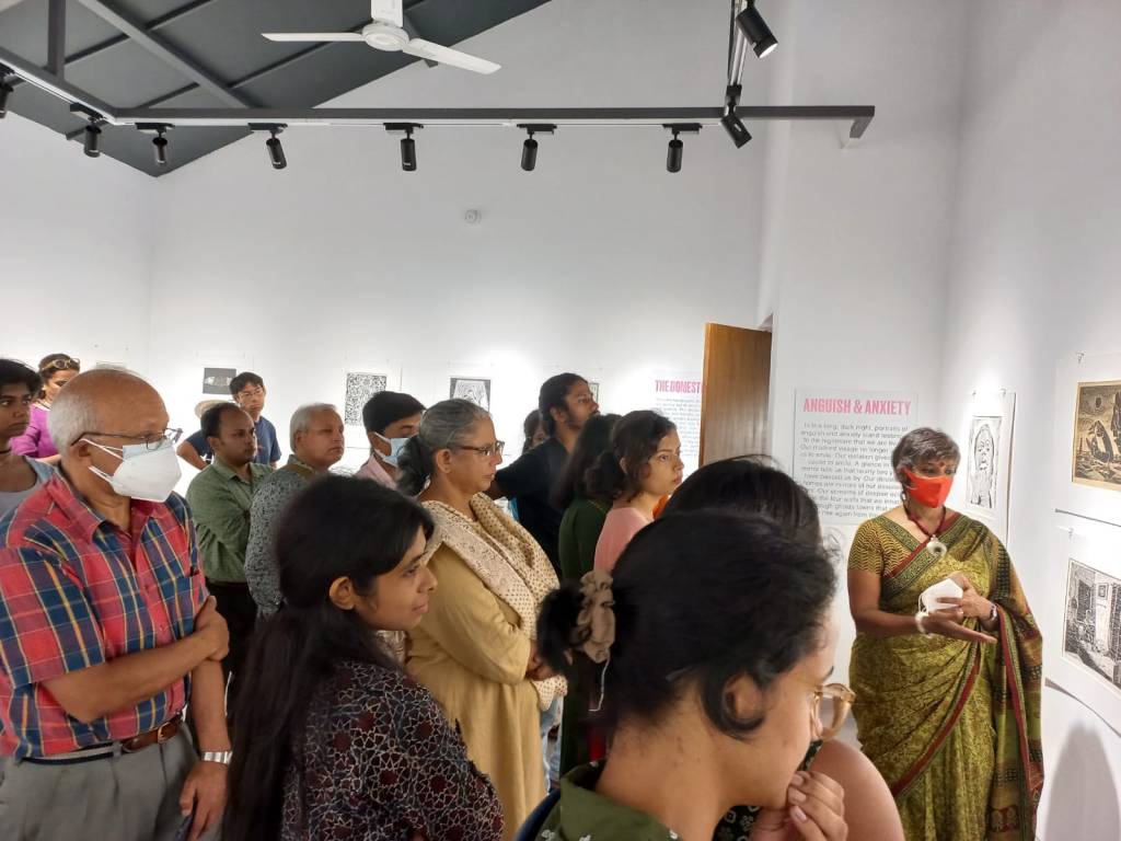 A selection of about 80 prints was displayed at Arthshila Ahmedabad. The exhibition opened with a guided walkthrough by Leenika Jacob, Co-founder, Kala Chaupal Trust and Avni Bansal, an artist and Curatorial Assistant to the project. The opening was attended by renowned printmakers of Ahmedabad and by architecture students of CEPT and Nirma University. It was a very enriching and inspiring experience for the architecture students to go through the black and white relief prints. The prints resonated with their pandemic experiences and led them to unfold their thoughts whilst viewing the exhibition.
