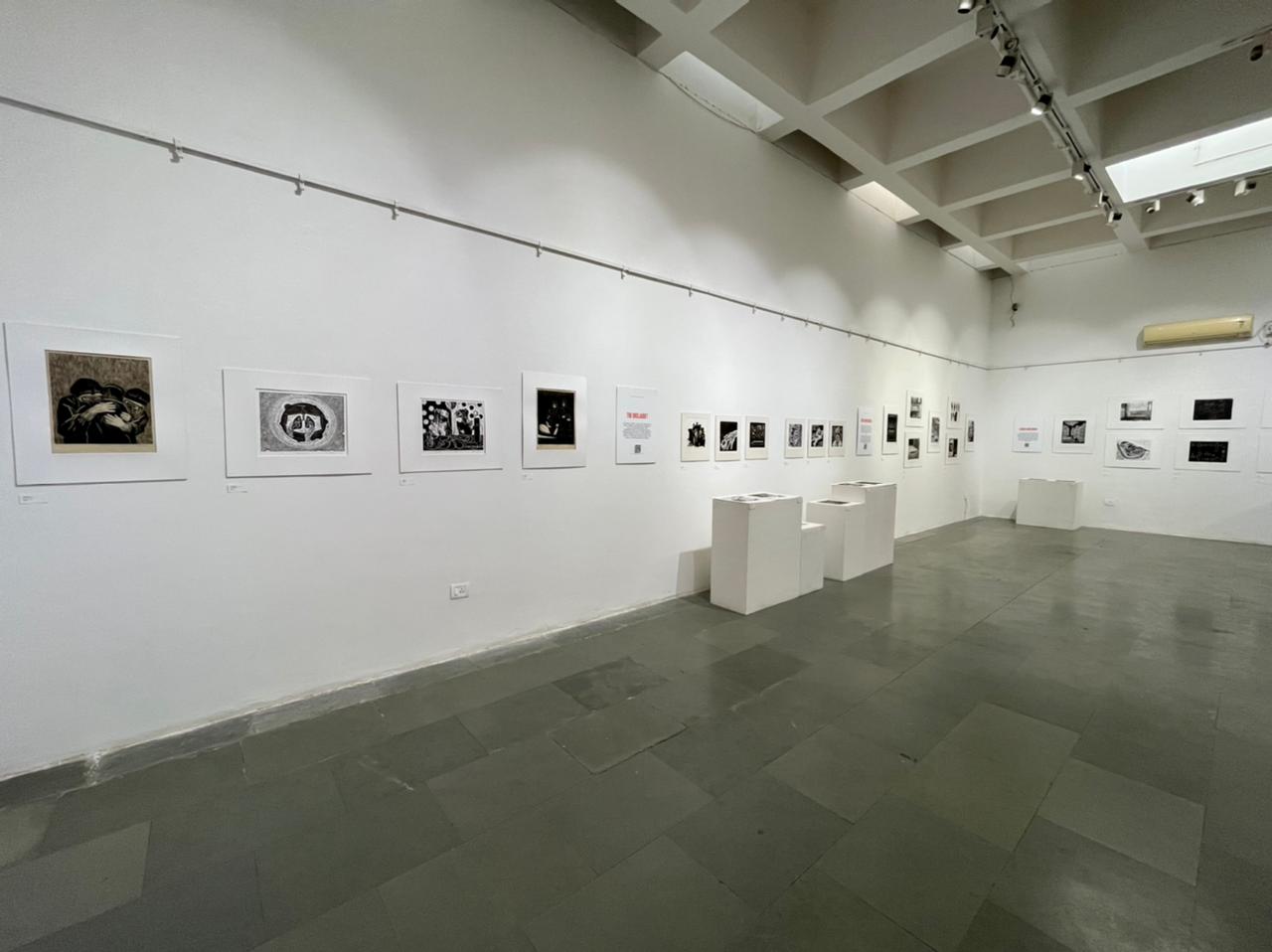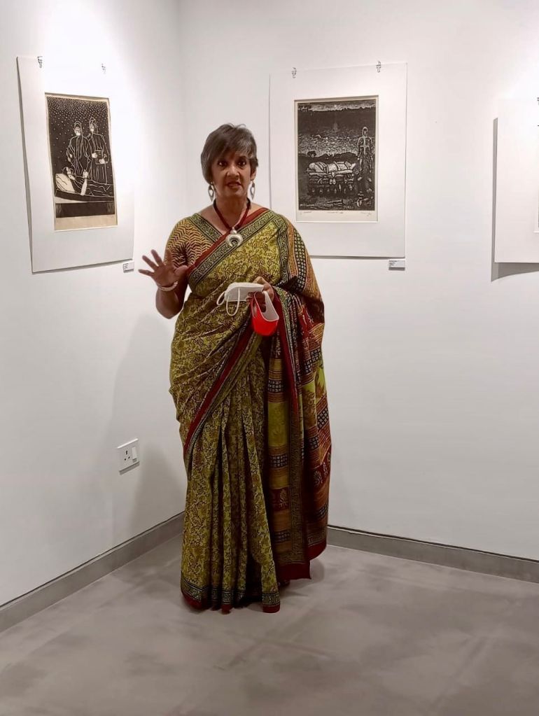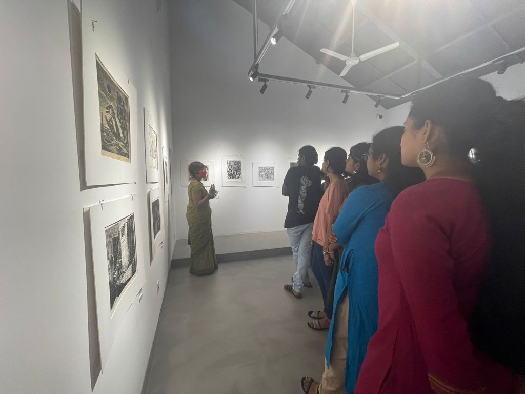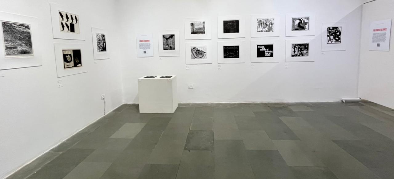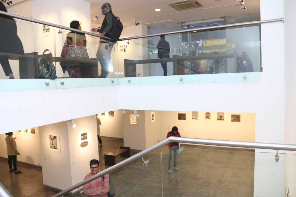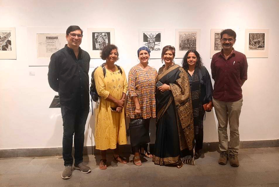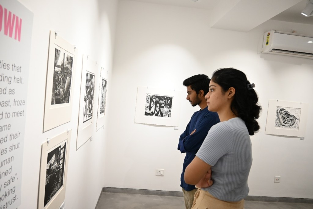A selection of about 80 prints was displayed at Arthshila Ahmedabad. The exhibition opened with a guided walkthrough by Leenika Jacob, Co-founder, Kala Chaupal Trust and Avni Bansal, an artist and Curatorial Assistant to the project. The opening was attended by renowned printmakers of Ahmedabad and by architecture students of CEPT and Nirma University. It was a very enriching and inspiring experience for the architecture students to go through the black and white relief prints. The prints resonated with their pandemic experiences and led them to unfold their thoughts whilst viewing the exhibition.