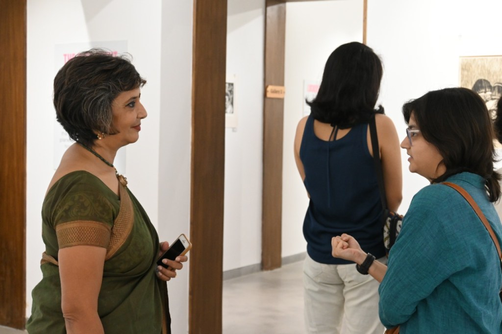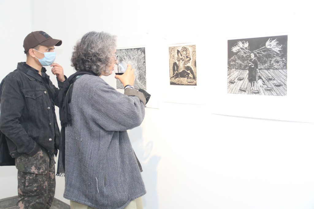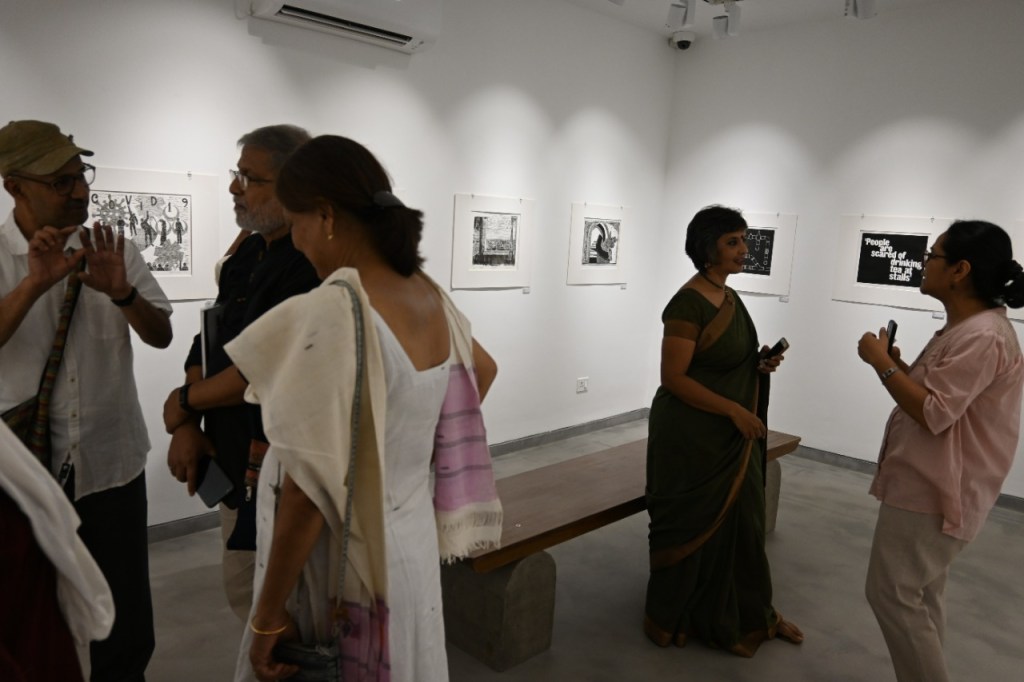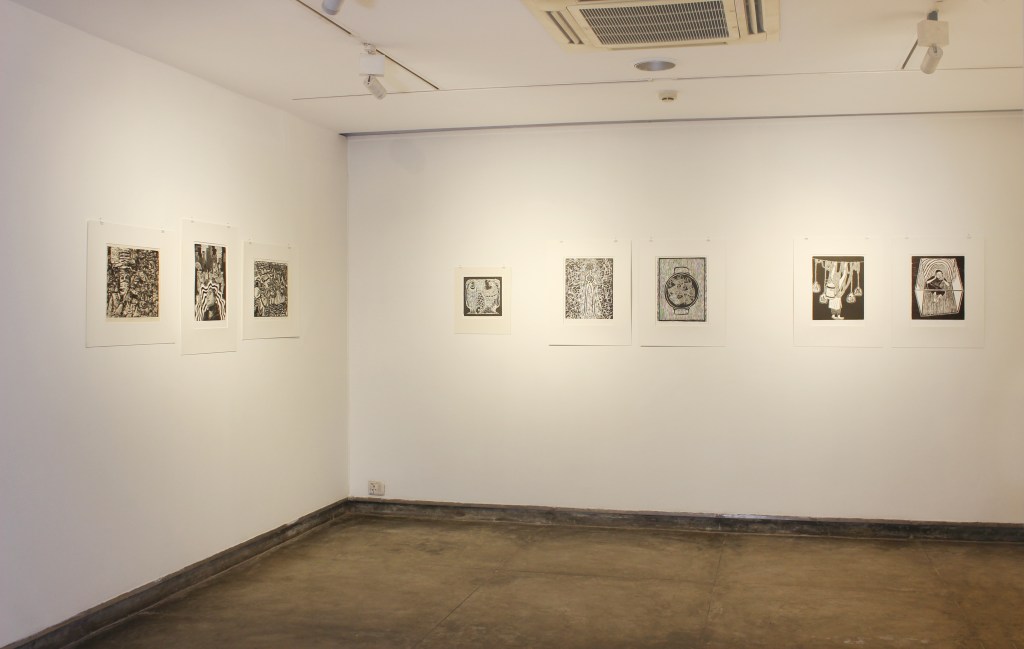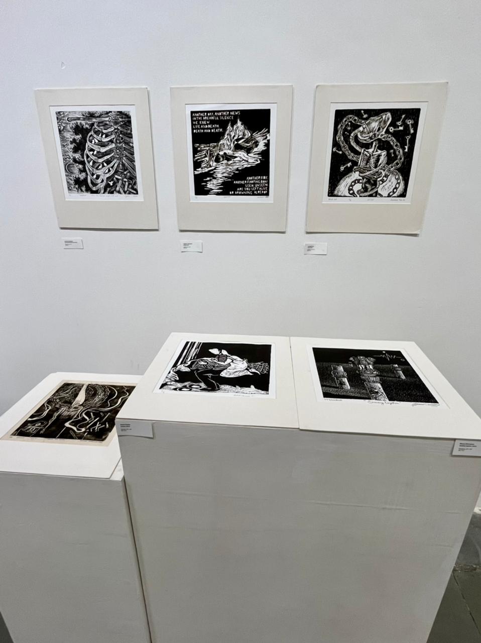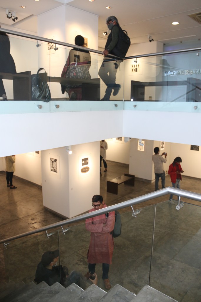 A selection of about 80 prints was displayed at Arthshila Ahmedabad. The exhibition opened with a guided walkthrough by Leenika Jacob, Co-founder, Kala Chaupal Trust and Avni Bansal, an artist and Curatorial Assistant to the project. The opening was attended by renowned printmakers of Ahmedabad and by architecture students of CEPT and Nirma University. It was a very enriching and inspiring experience for the architecture students to go through the black and white relief prints. The prints resonated with their pandemic experiences and led them to unfold their thoughts whilst viewing the exhibition.