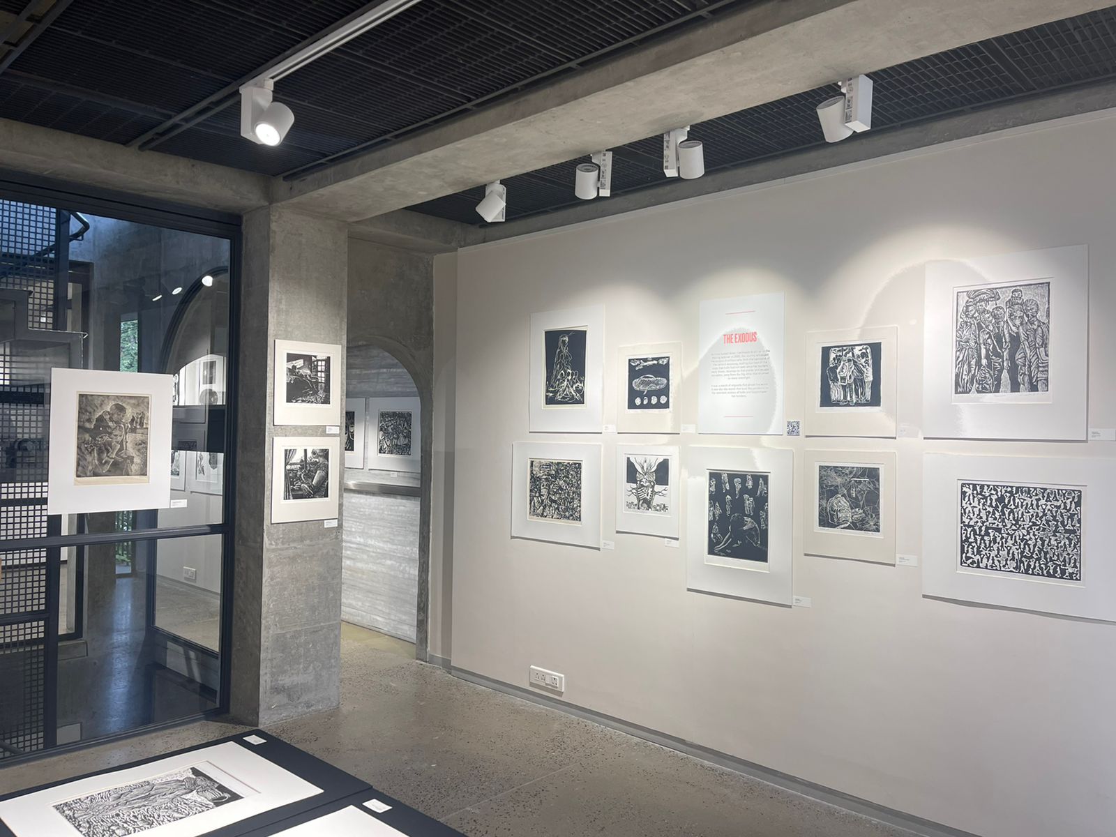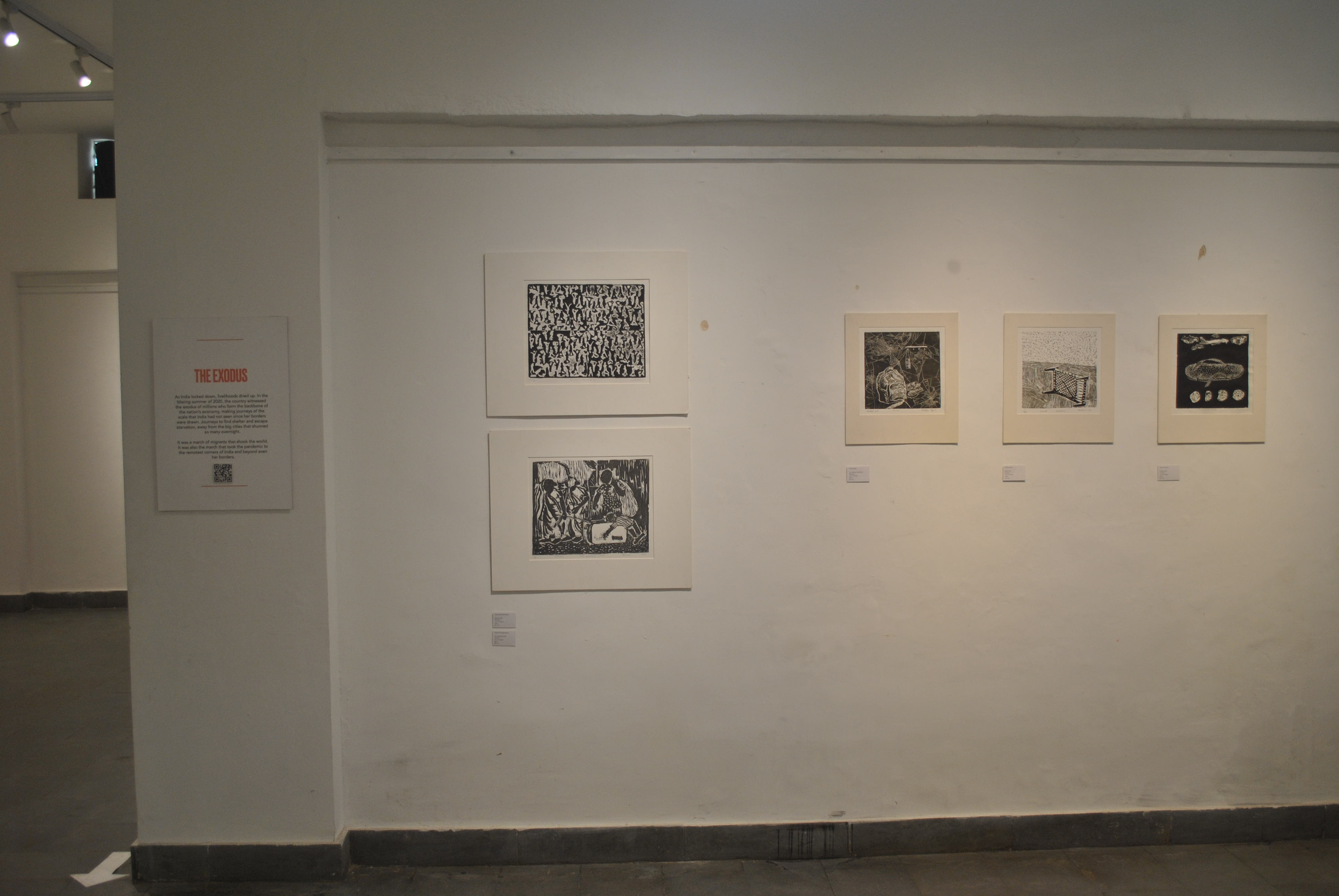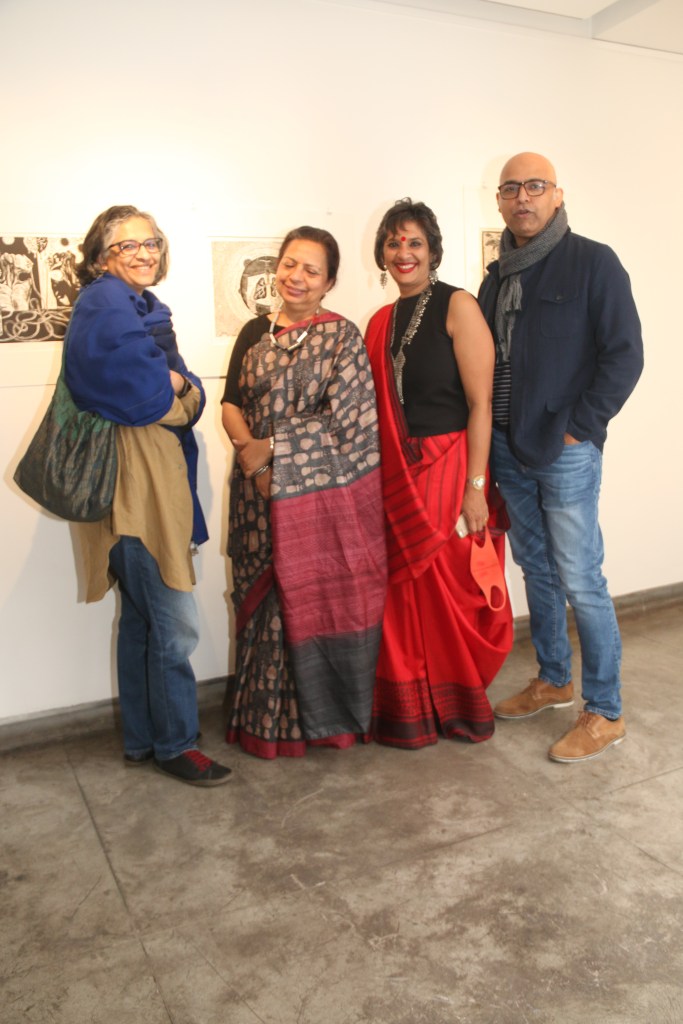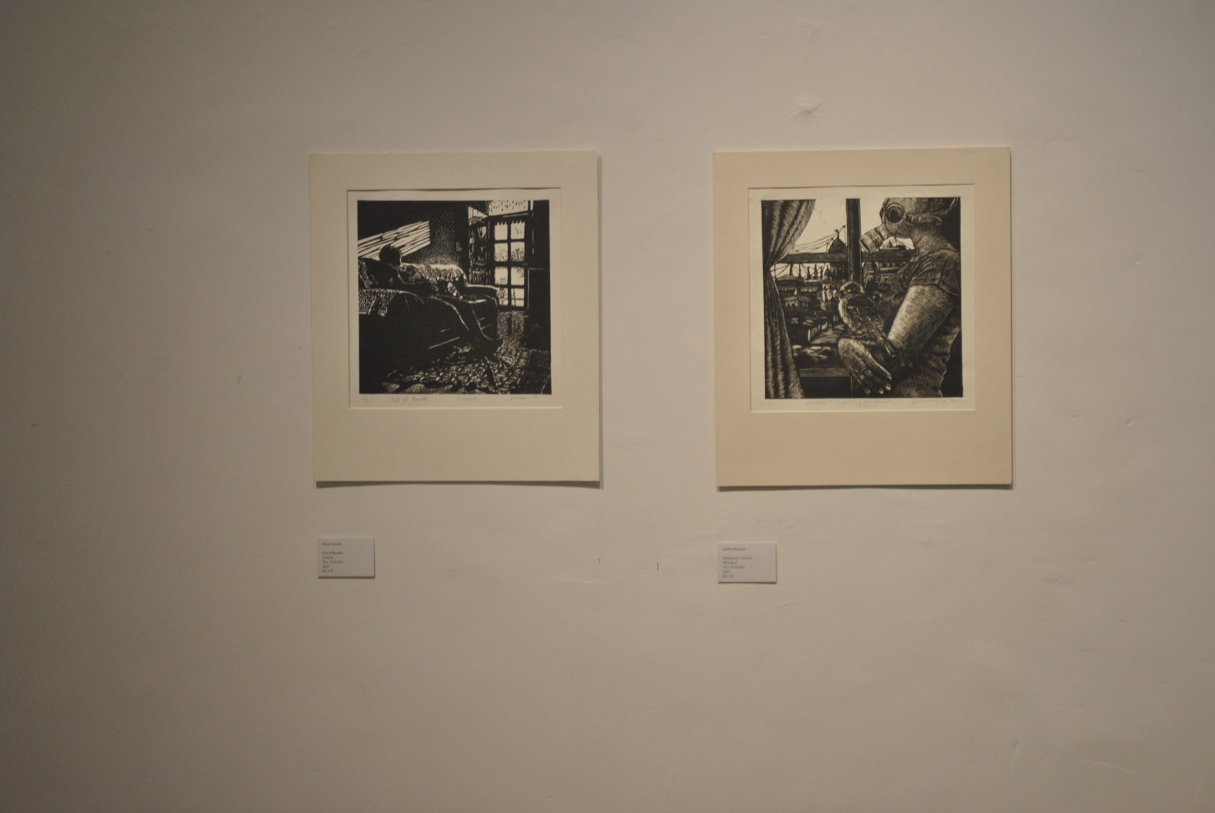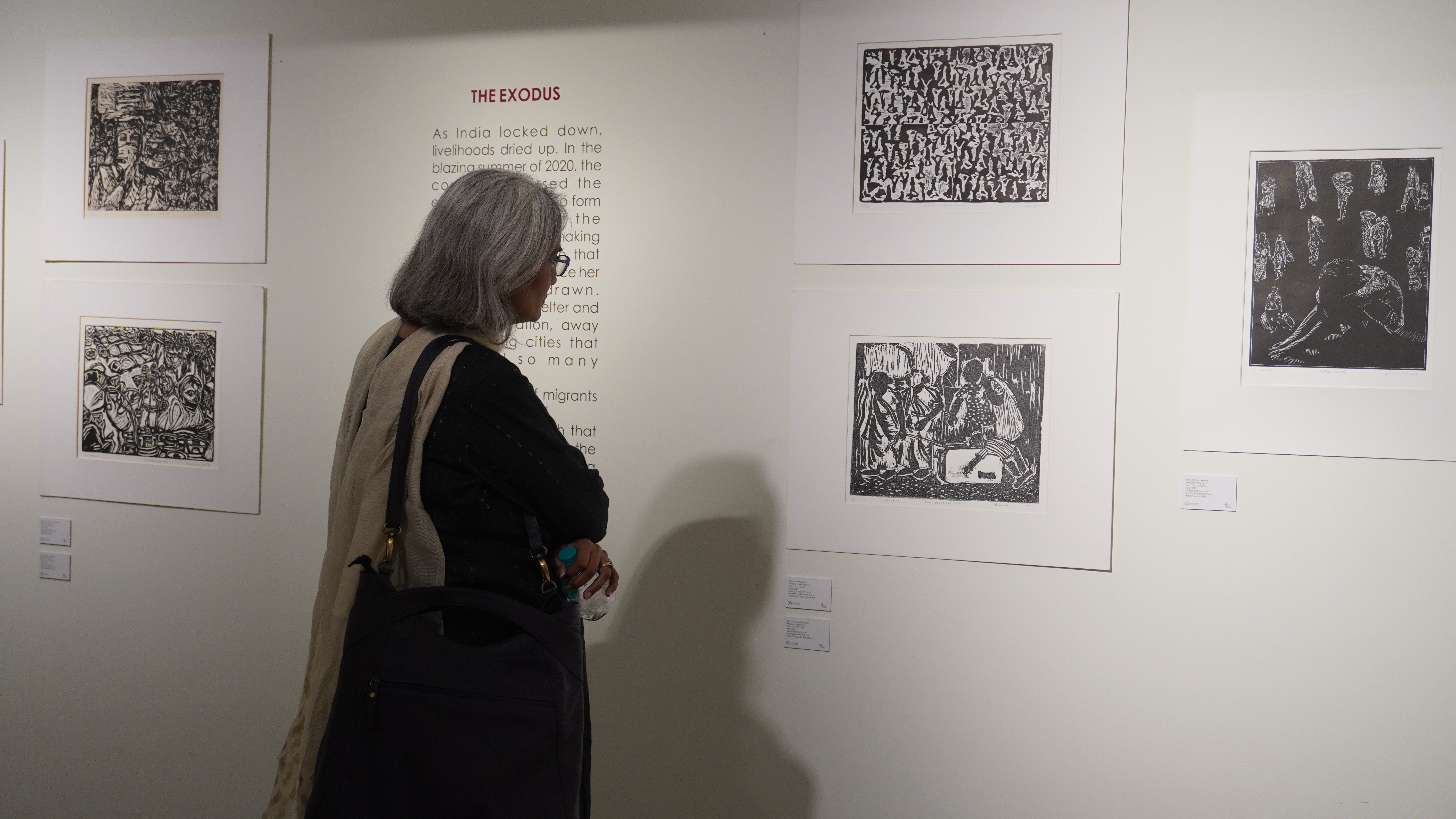 A selection of about 80 prints was displayed at Arthshila Ahmedabad. The exhibition opened with a guided walkthrough by Leenika Jacob, Co-founder, Kala Chaupal Trust and Avni Bansal, an artist and Curatorial Assistant to the project. The opening was attended by renowned printmakers of Ahmedabad and by architecture students of CEPT and Nirma University. It was a very enriching and inspiring experience for the architecture students to go through the black and white relief prints. The prints resonated with their pandemic experiences and led them to unfold their thoughts whilst viewing the exhibition.