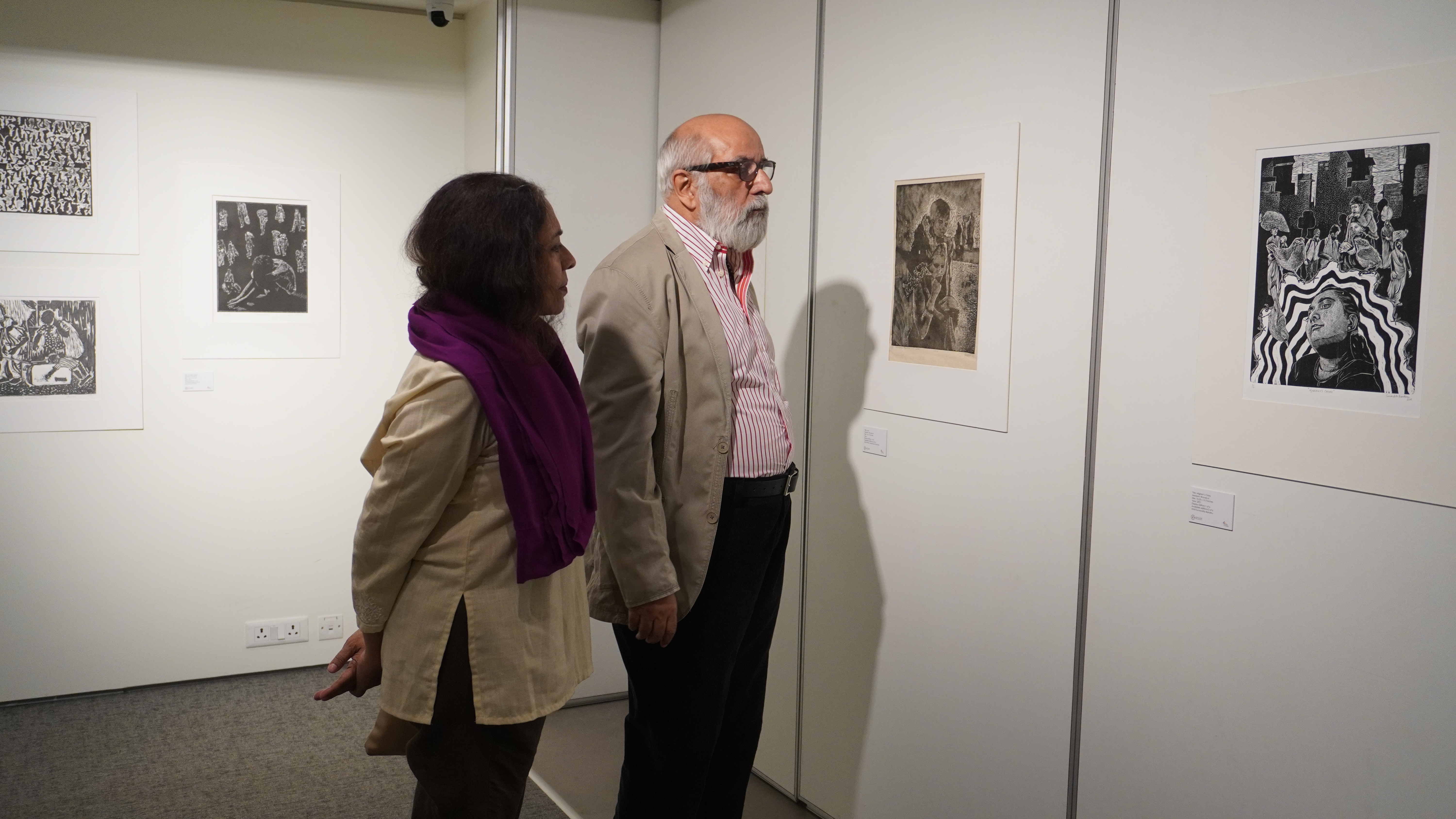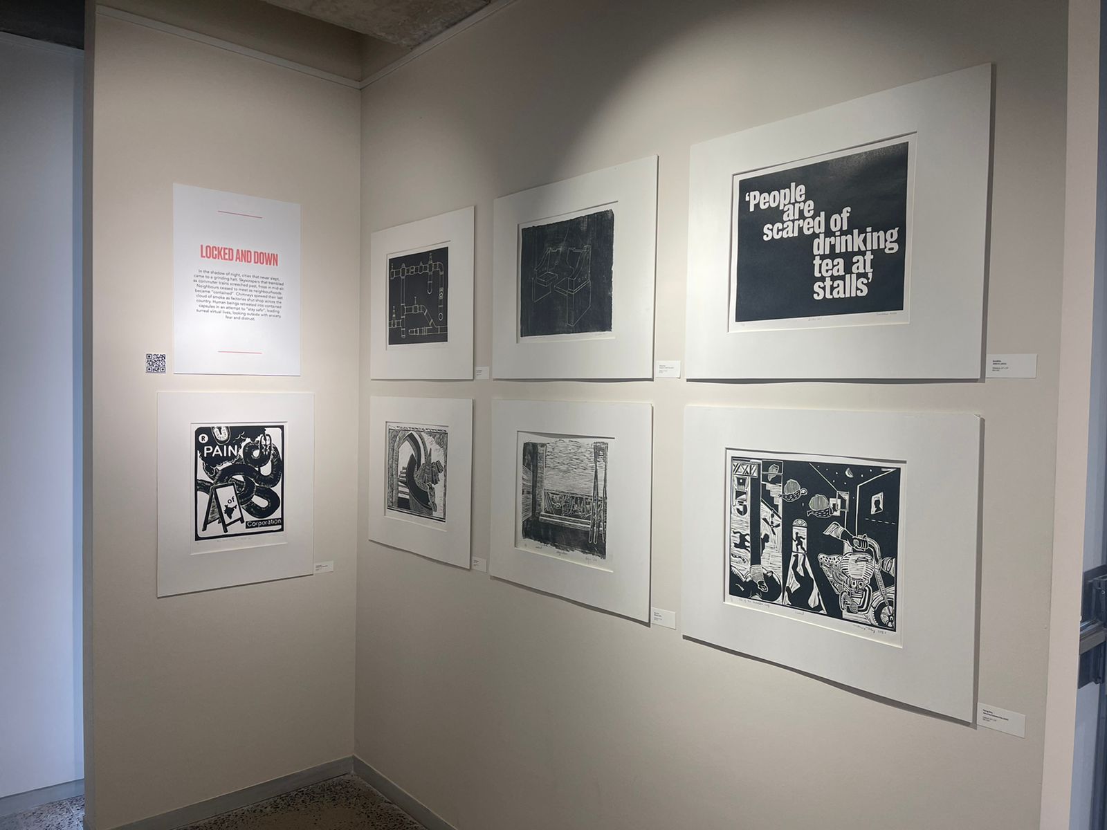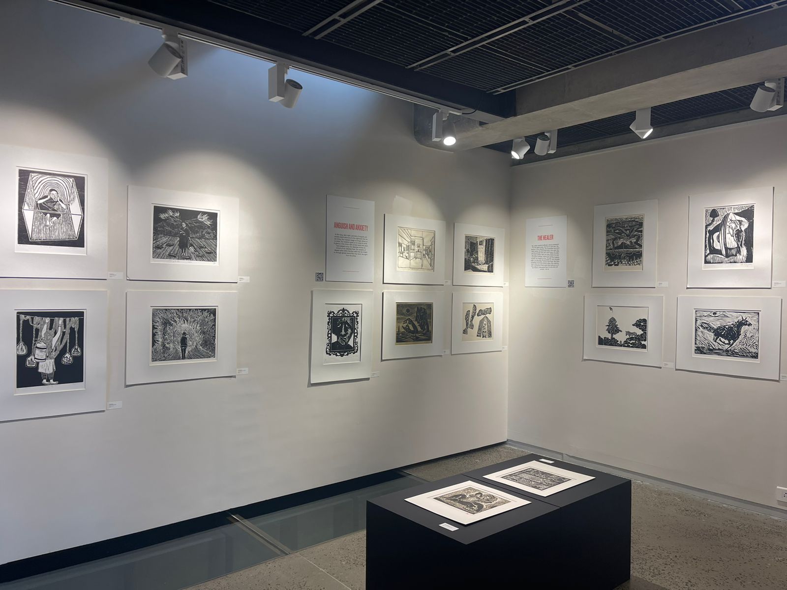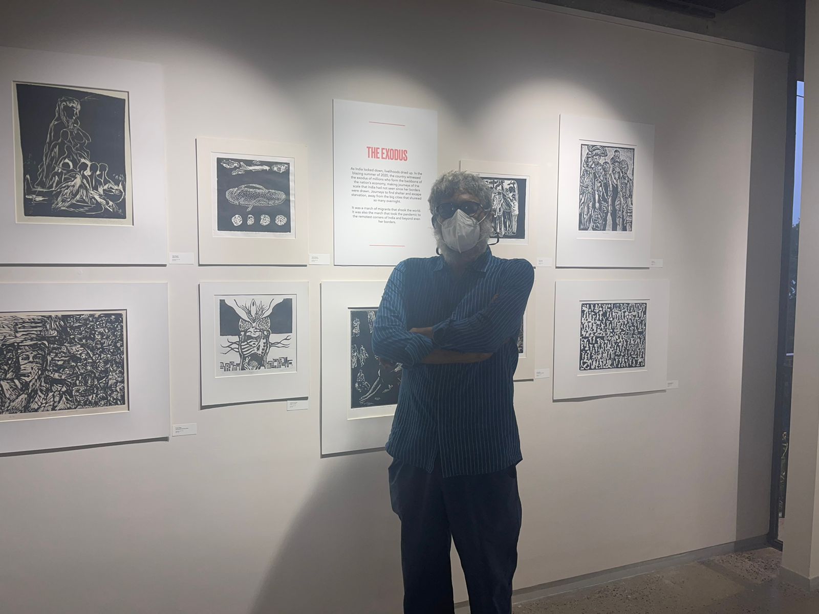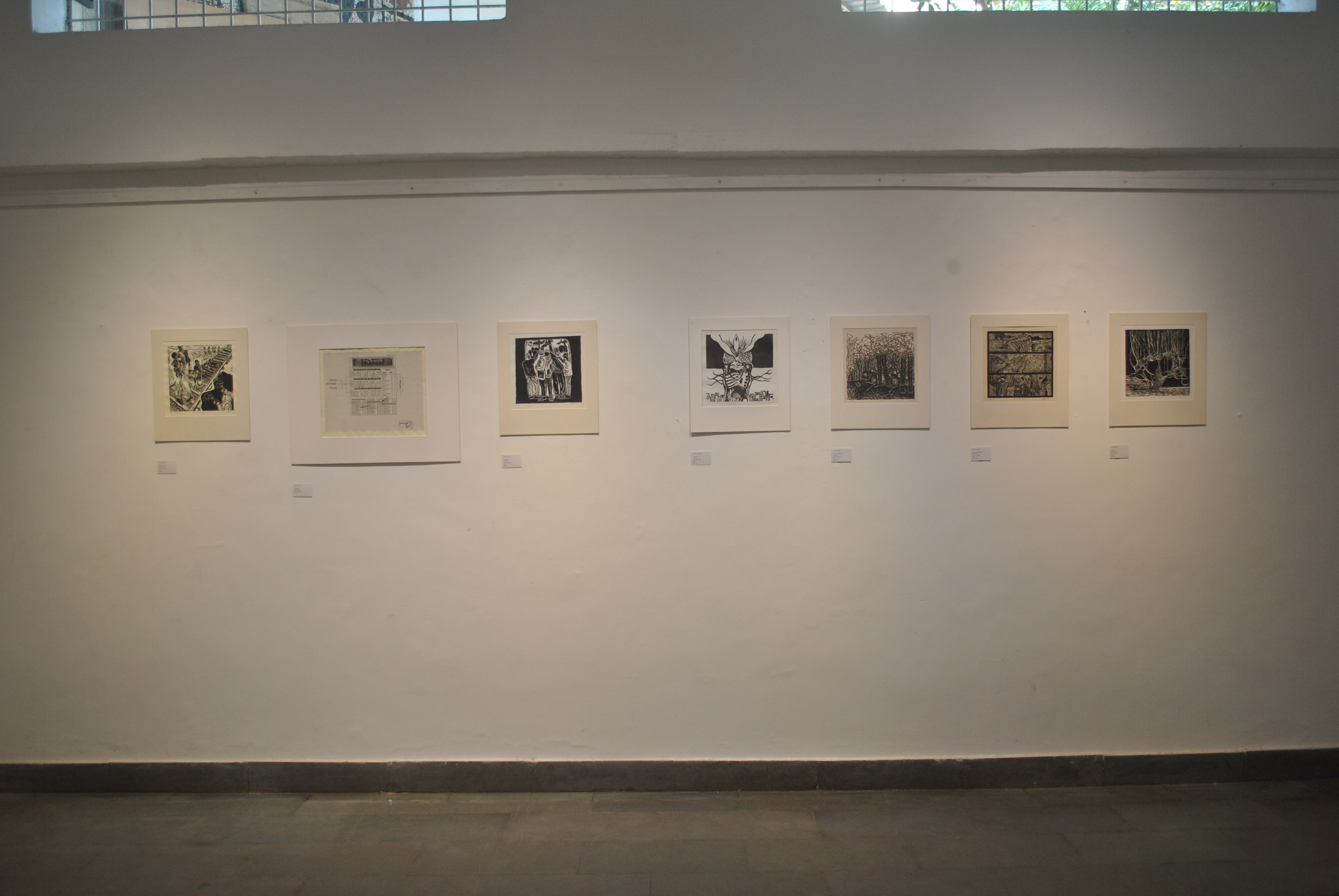 A selection of about 80 prints was displayed at Arthshila Ahmedabad. The exhibition opened with a guided walkthrough by Leenika Jacob, Co-founder, Kala Chaupal Trust and Avni Bansal, an artist and Curatorial Assistant to the project. The opening was attended by renowned printmakers of Ahmedabad and by architecture students of CEPT and Nirma University. It was a very enriching and inspiring experience for the architecture students to go through the black and white relief prints. The prints resonated with their pandemic experiences and led them to unfold their thoughts whilst viewing the exhibition.