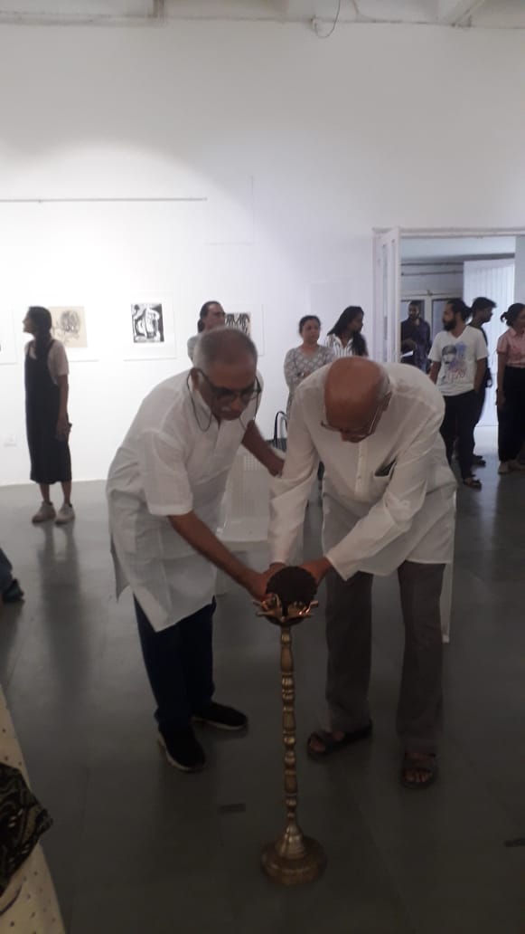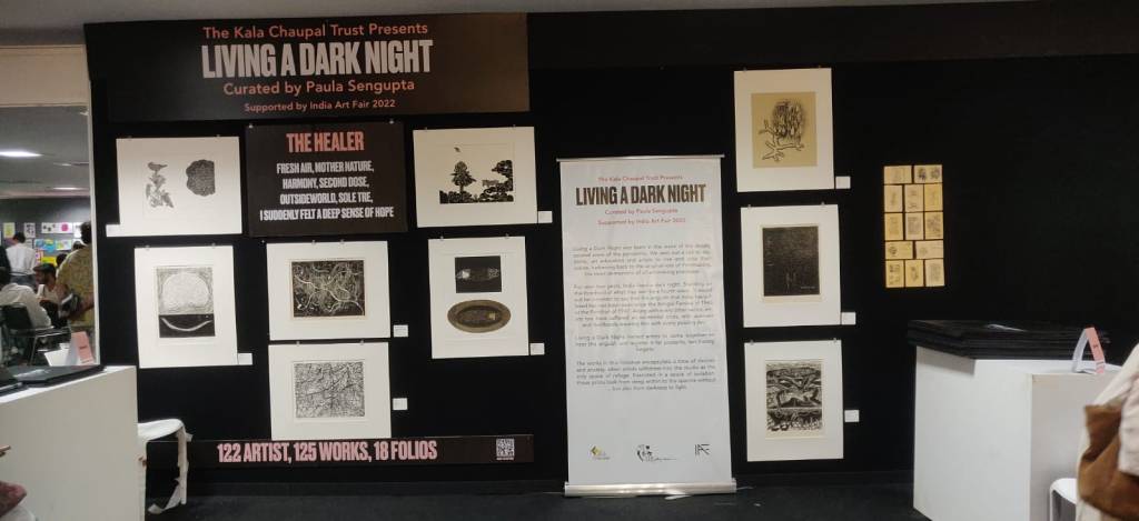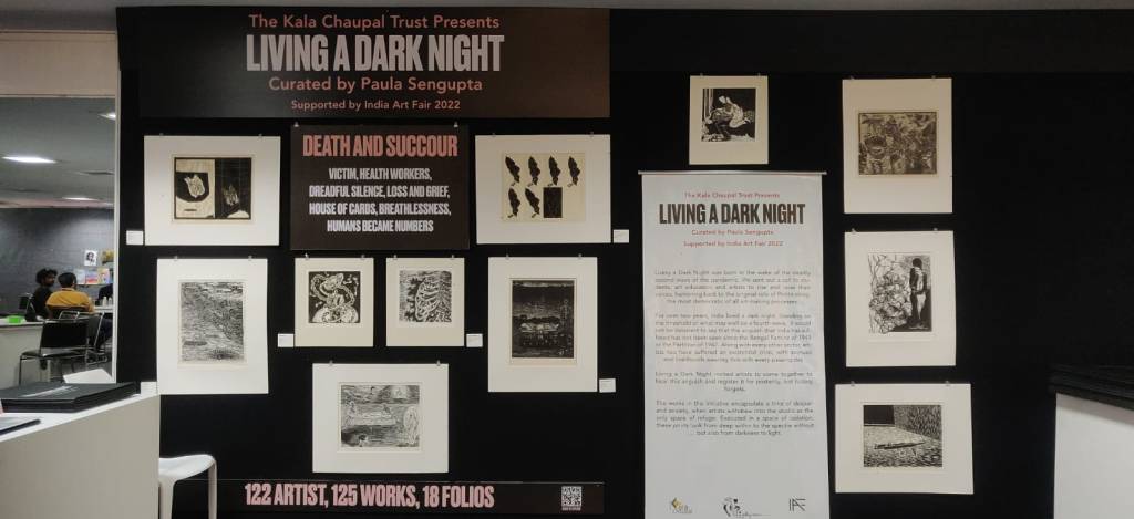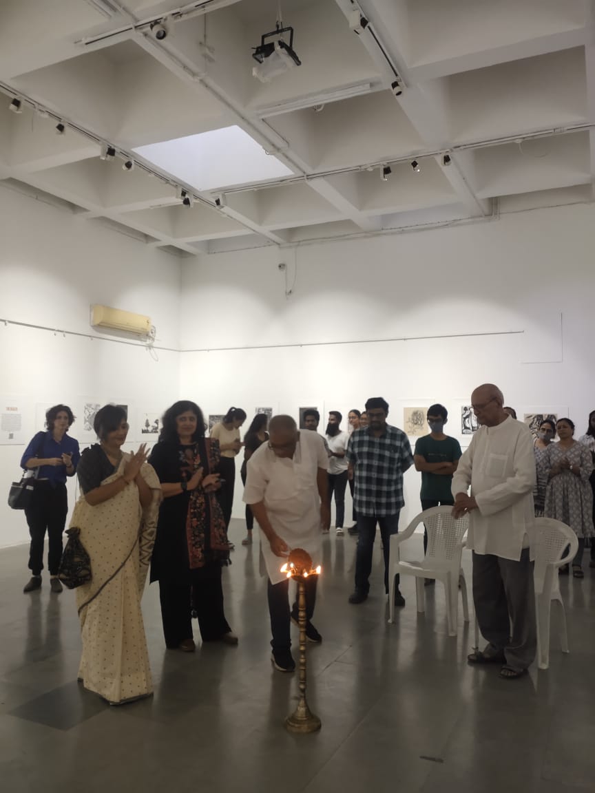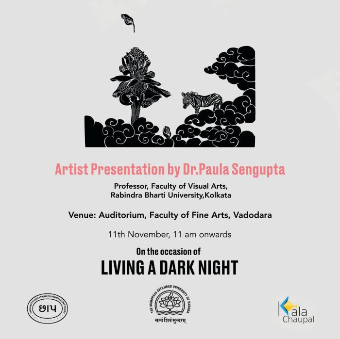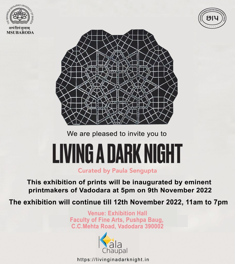 The fifth iteration of Living a Dark Night opens at the Maharaja Sayajirao University of Baroda in collaboration with the historic ‘Chhaap’ Foundation for Printmaking Trust. The exhibition was inaugurated in the presence of teachers and students from the Fine Art Faculty and eminent printmakers Padma Shri Jyoti Bhatt, Bijoy Baggodi, and many others. The exhibition was displayed for 3 days and was well attended by the fine arts students from MSU and other universities.