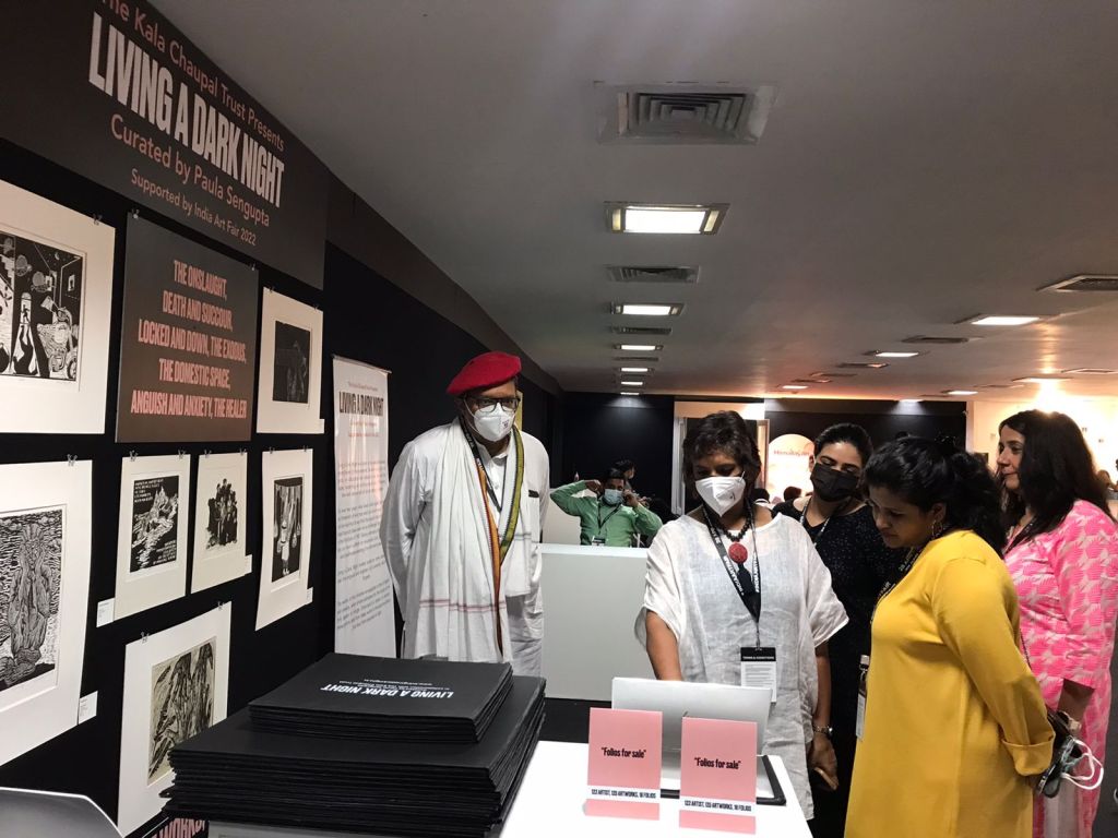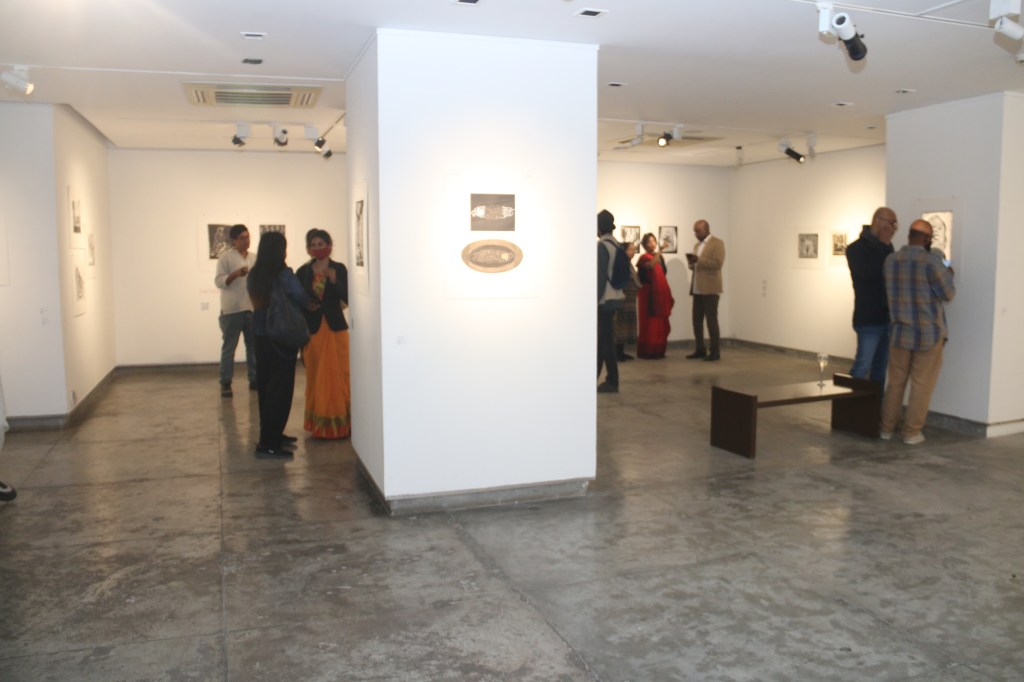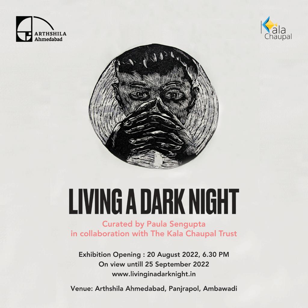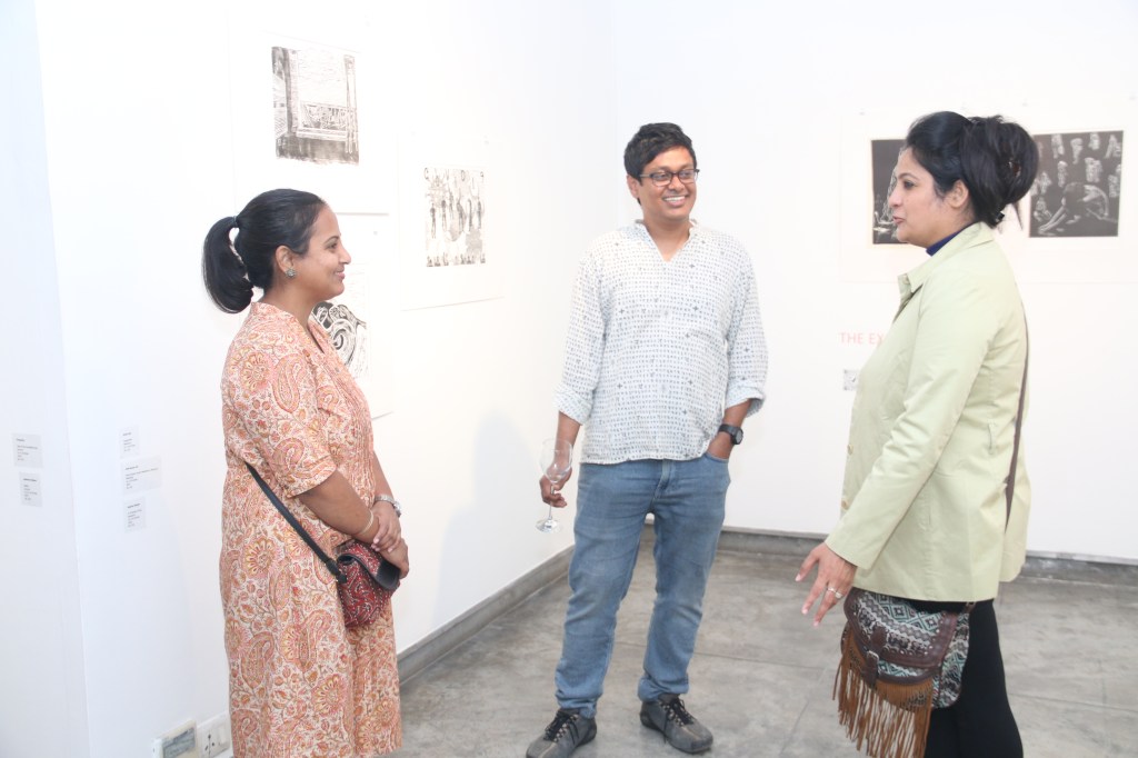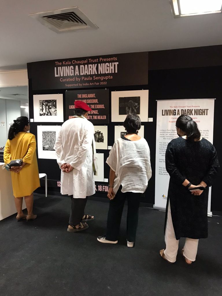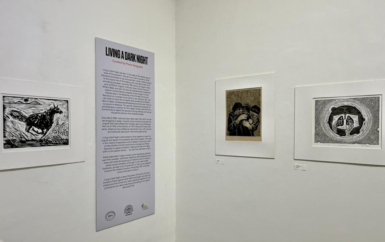 The fifth iteration of Living a Dark Night opens at the Maharaja Sayajirao University of Baroda in collaboration with the historic ‘Chhaap’ Foundation for Printmaking Trust. The exhibition was inaugurated in the presence of teachers and students from the Fine Art Faculty and eminent printmakers Padma Shri Jyoti Bhatt, Bijoy Baggodi, and many others. The exhibition was displayed for 3 days and was well attended by the fine arts students from MSU and other universities.