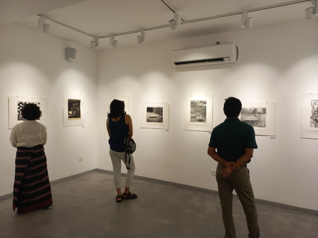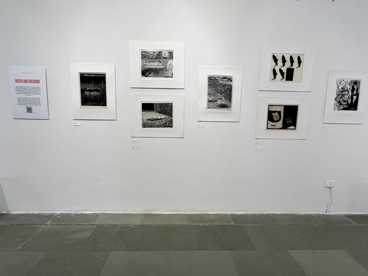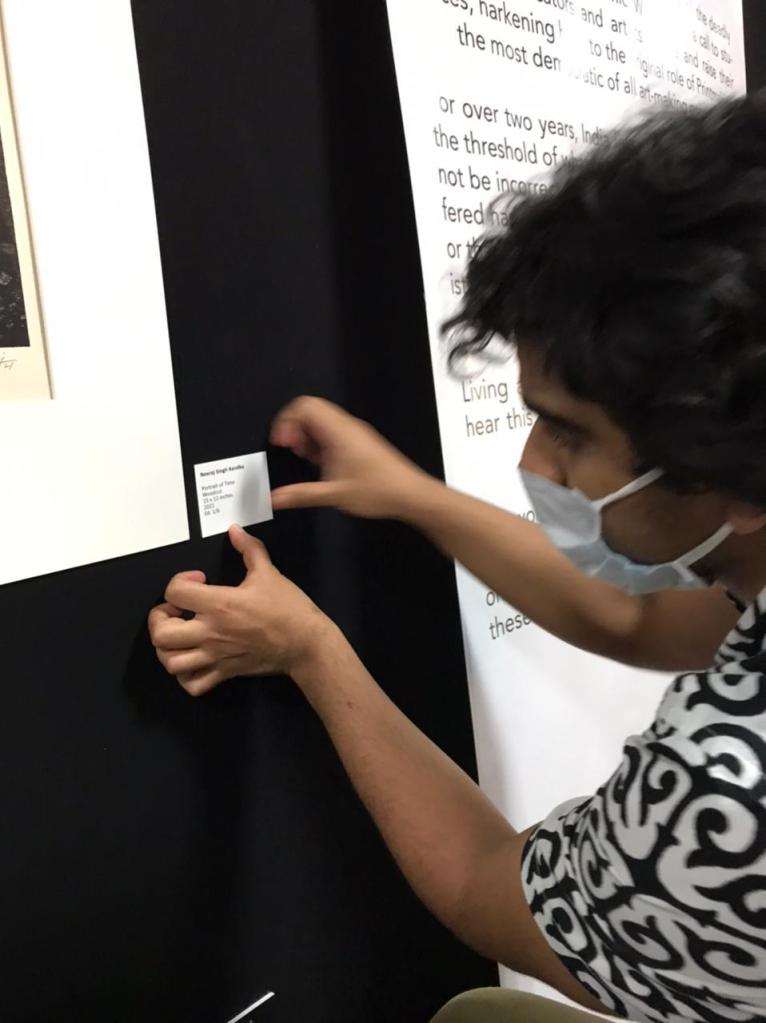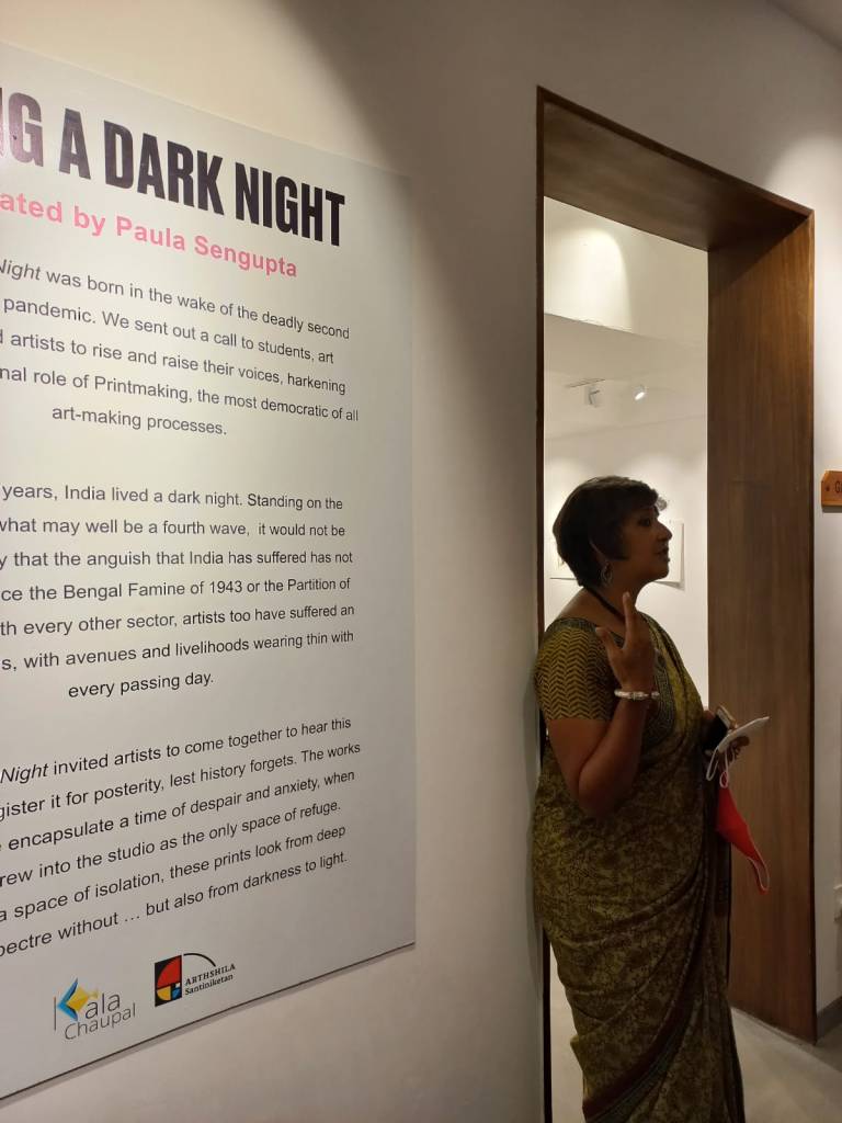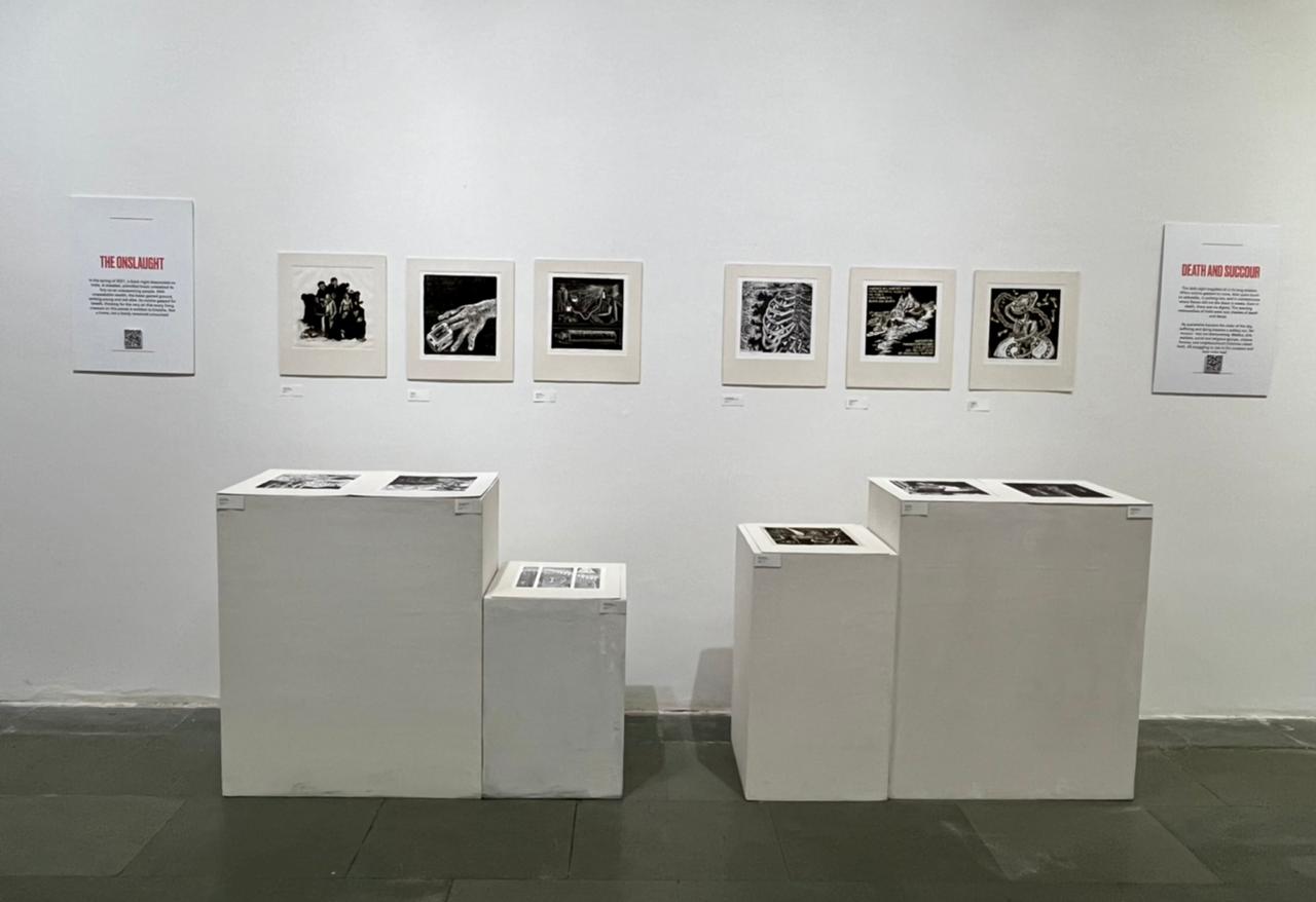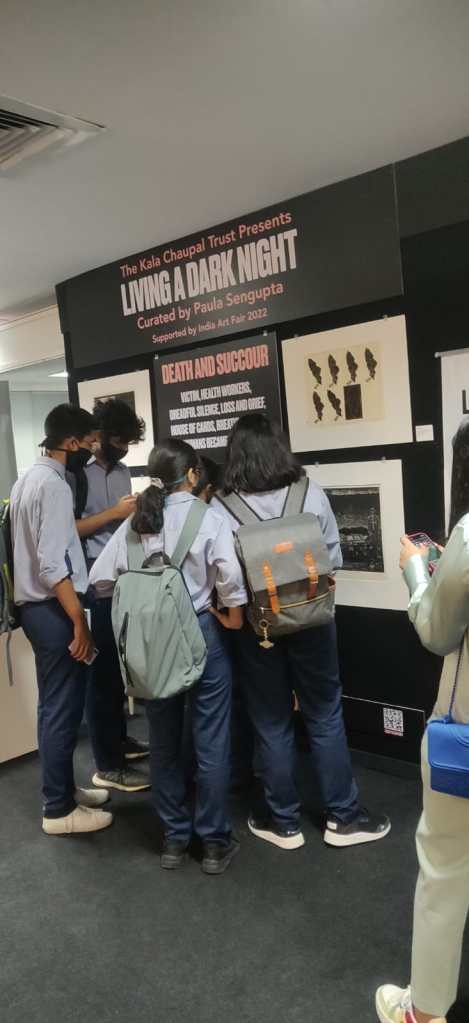 We were excited to showcase this large body of black and white relief prints at the birthplace of modern Indian printmaking, Santiniketan. The exhibition opened at Arthshila Santiniketan. The opening was well attended by faculty members and students from Kala Bhavana,Visva Bharati, as well as other members of the Santiniketan community. People were delighted to see such a large body of prints. Many also commented that the exhibition showcased several works of considerable merit. Some visitors were so moved that they shared their own COVID stories, as at other iterations of the exhibition. Our curator, Dr. Paula Sengupta, also gave a small introductory talk and guided people through the project website.