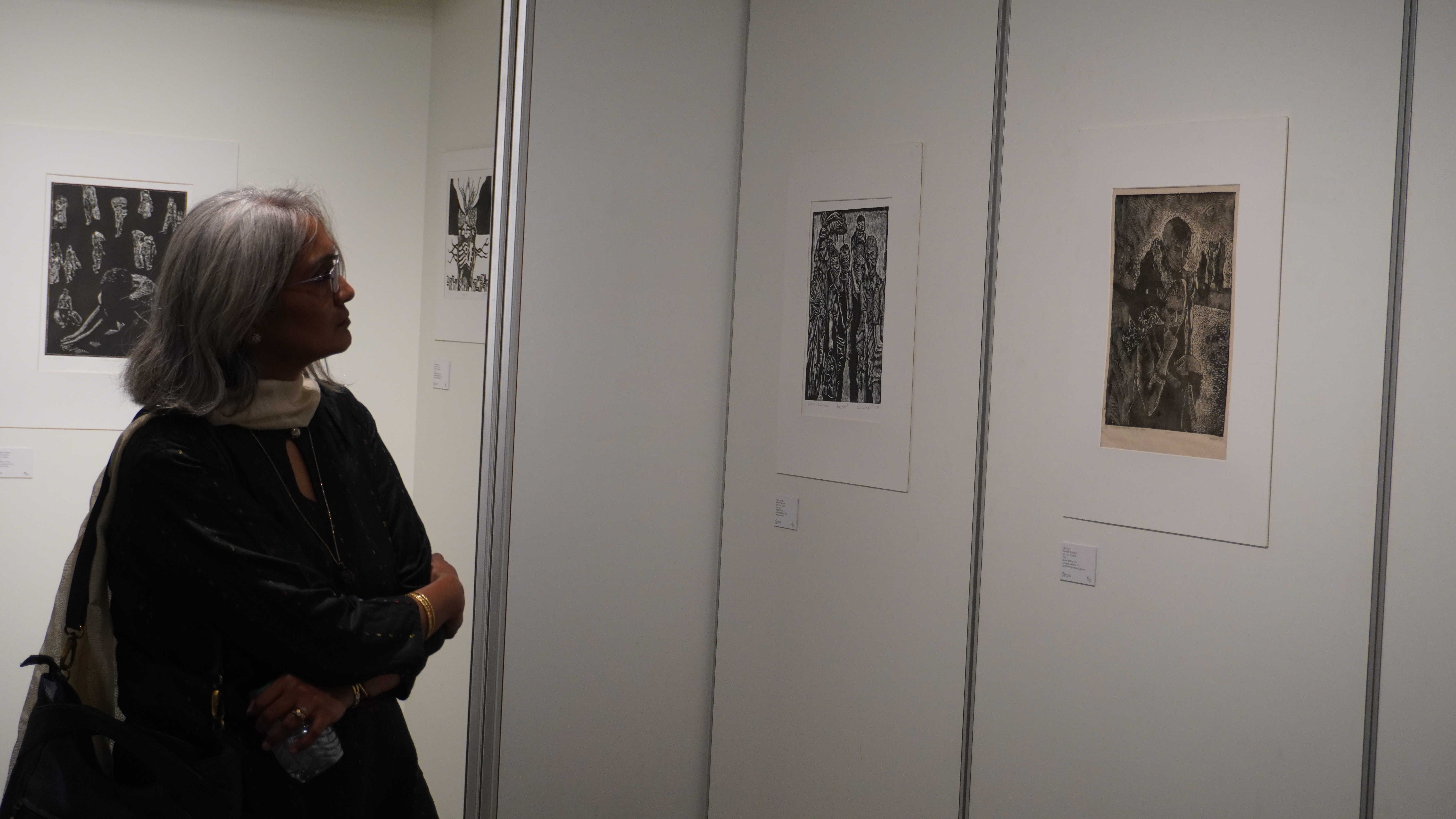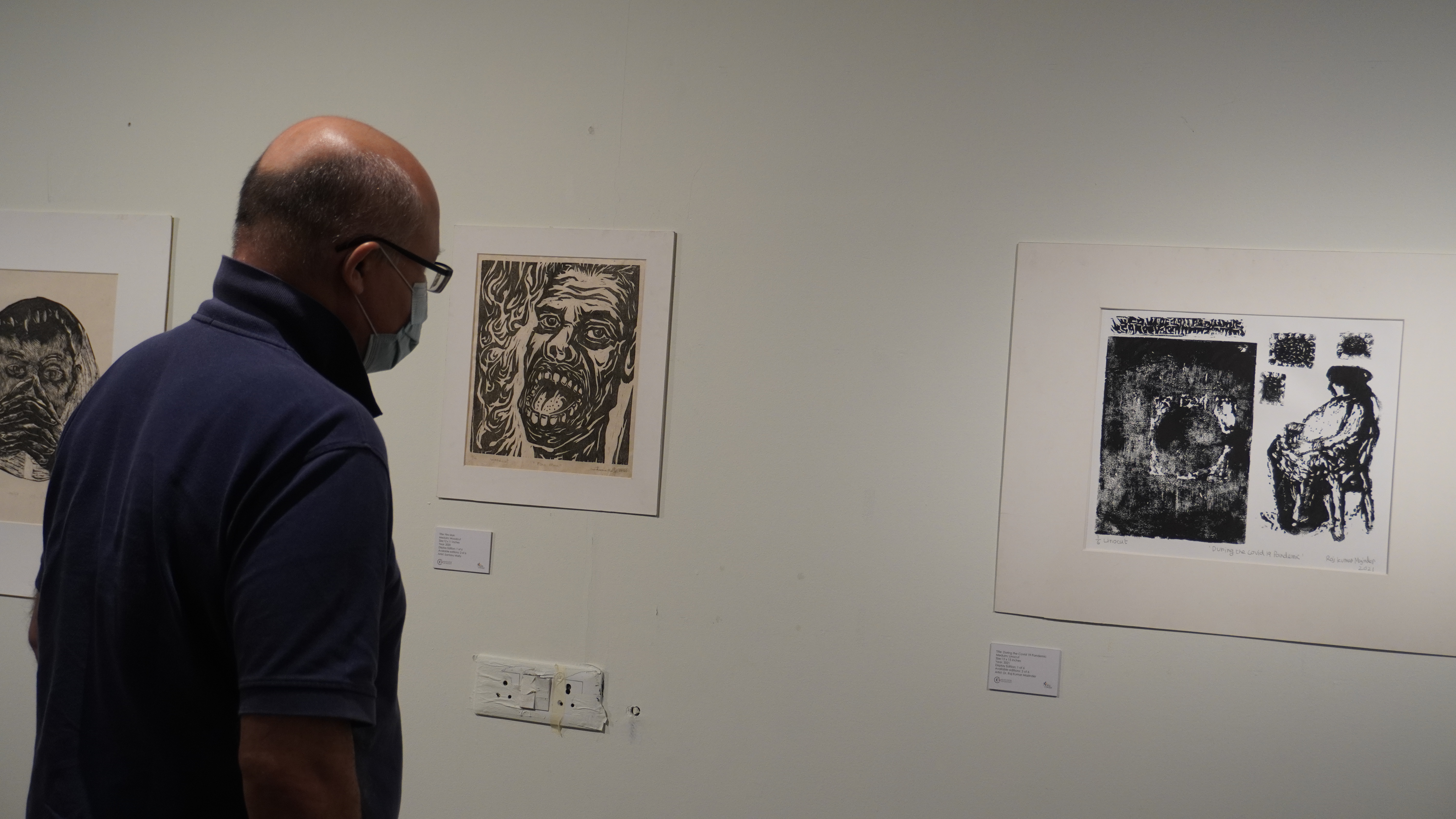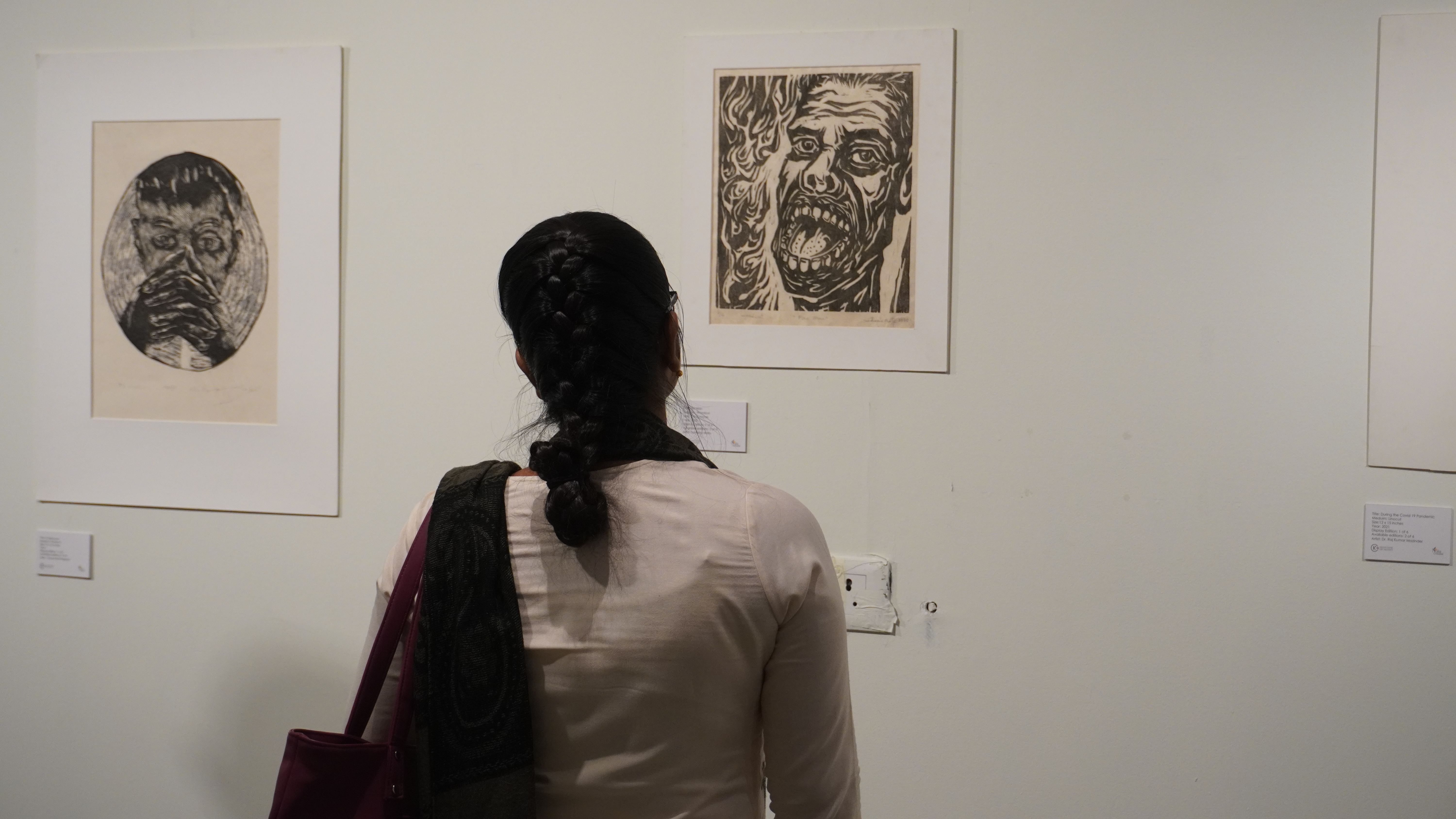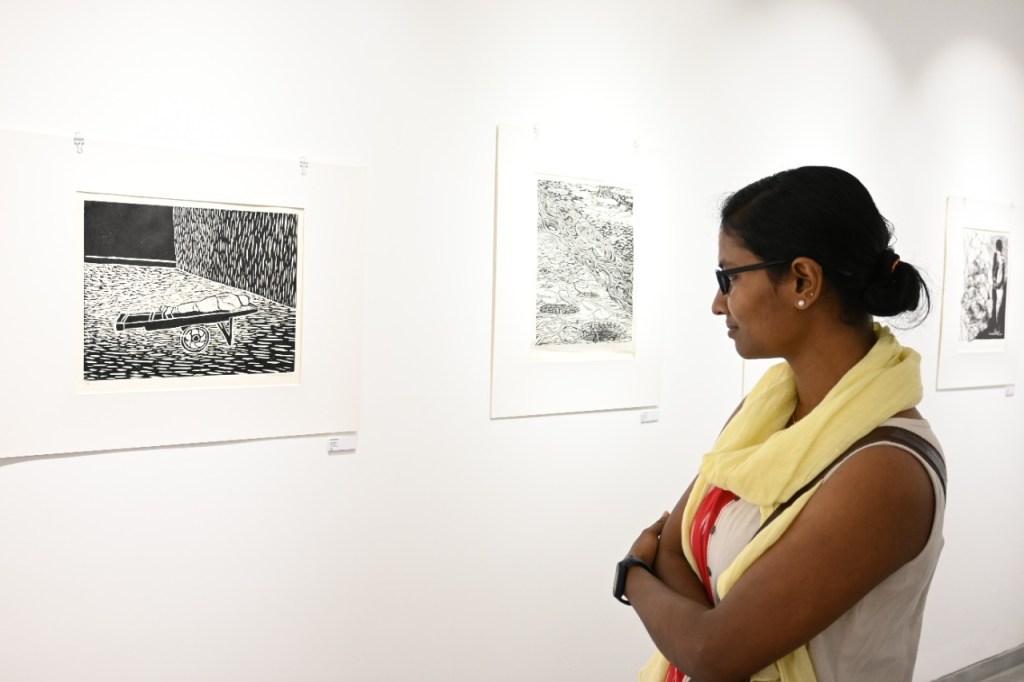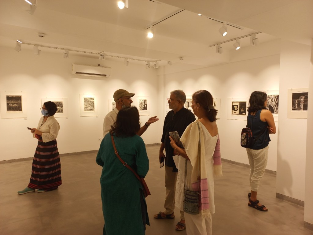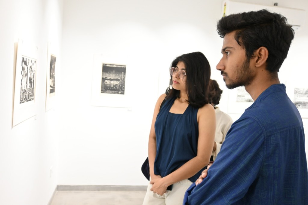 We were excited to showcase this large body of black and white relief prints at the birthplace of modern Indian printmaking, Santiniketan. The exhibition opened at Arthshila Santiniketan. The opening was well attended by faculty members and students from Kala Bhavana,Visva Bharati, as well as other members of the Santiniketan community. People were delighted to see such a large body of prints. Many also commented that the exhibition showcased several works of considerable merit. Some visitors were so moved that they shared their own COVID stories, as at other iterations of the exhibition. Our curator, Dr. Paula Sengupta, also gave a small introductory talk and guided people through the project website.