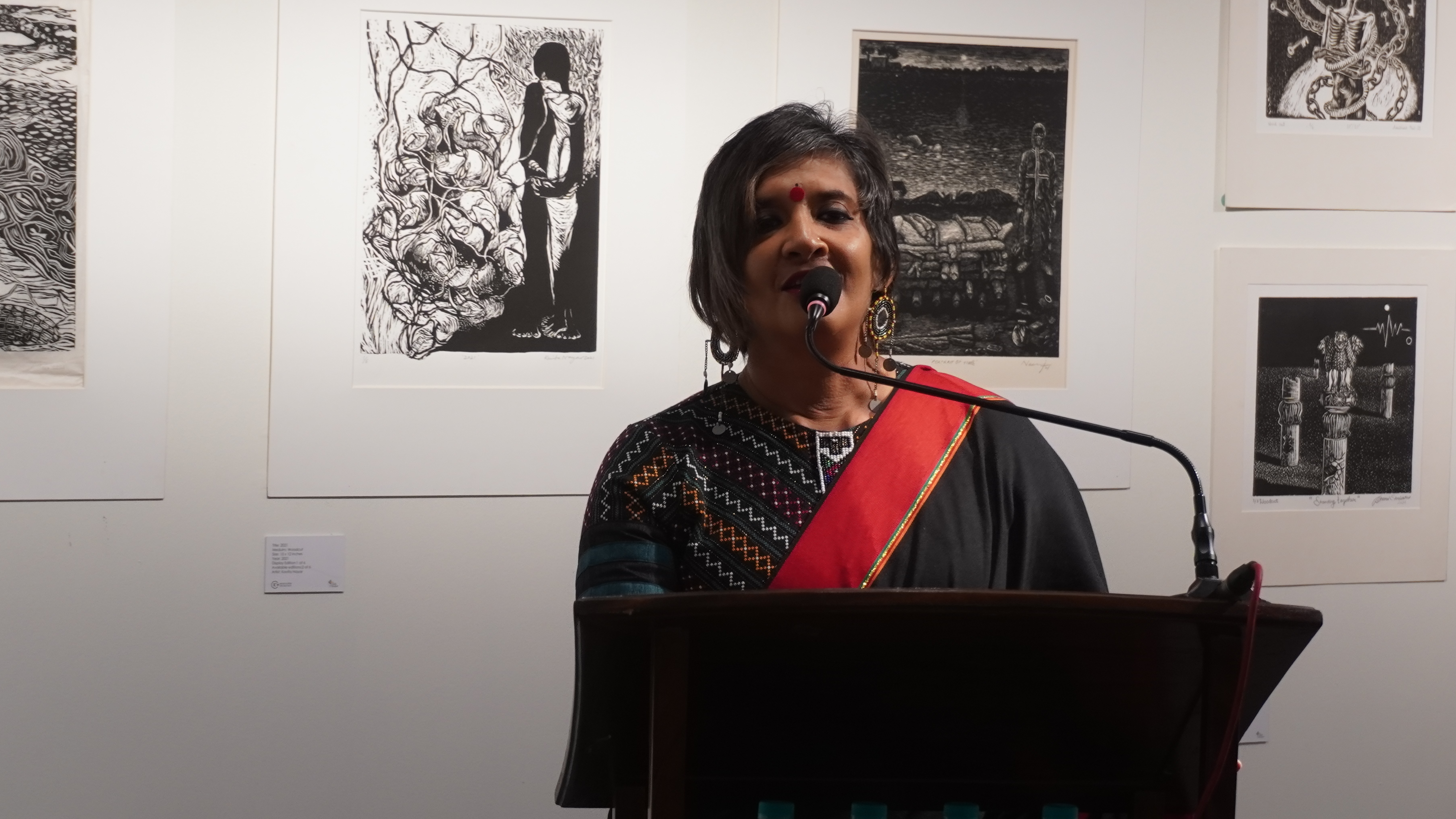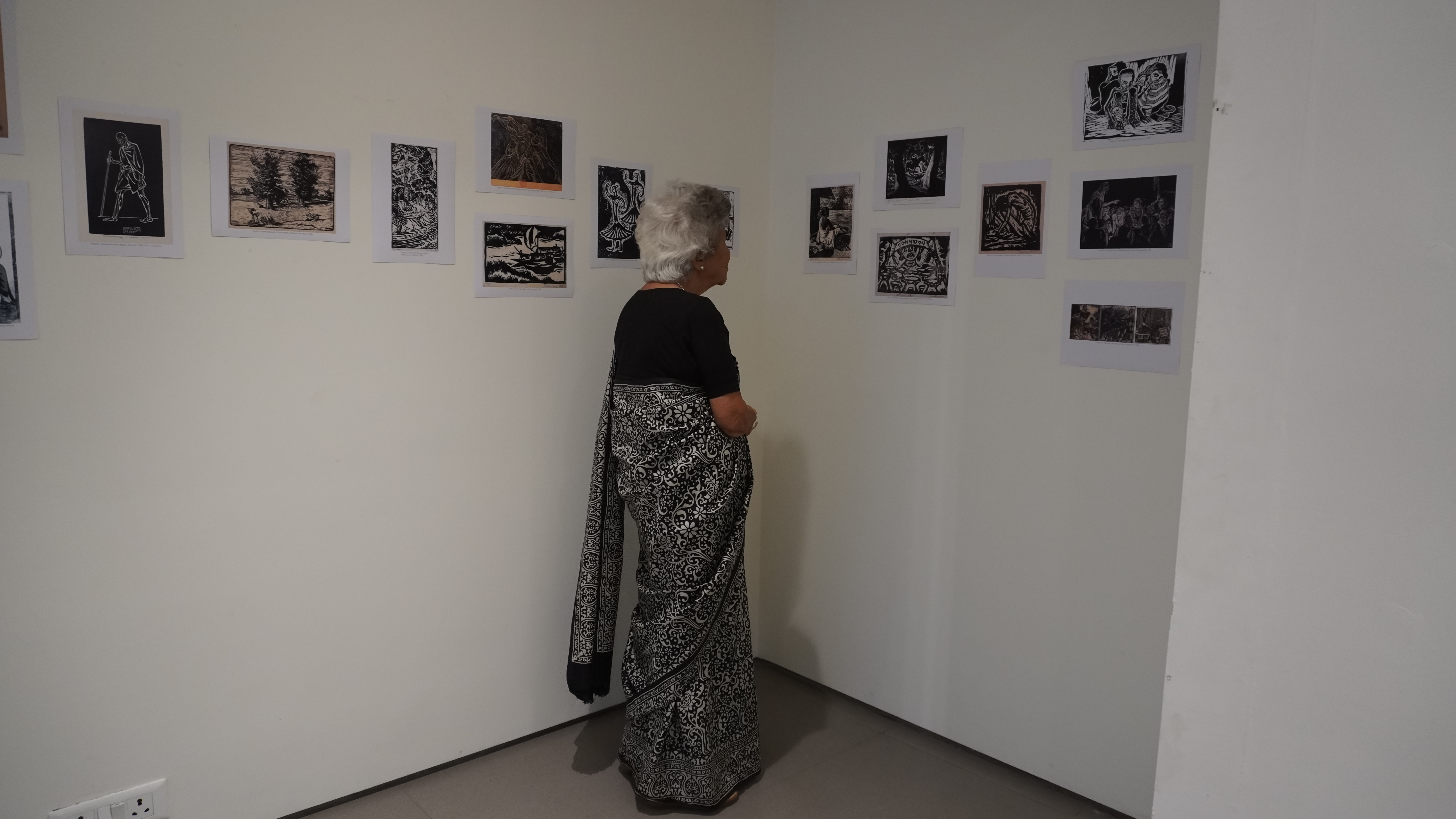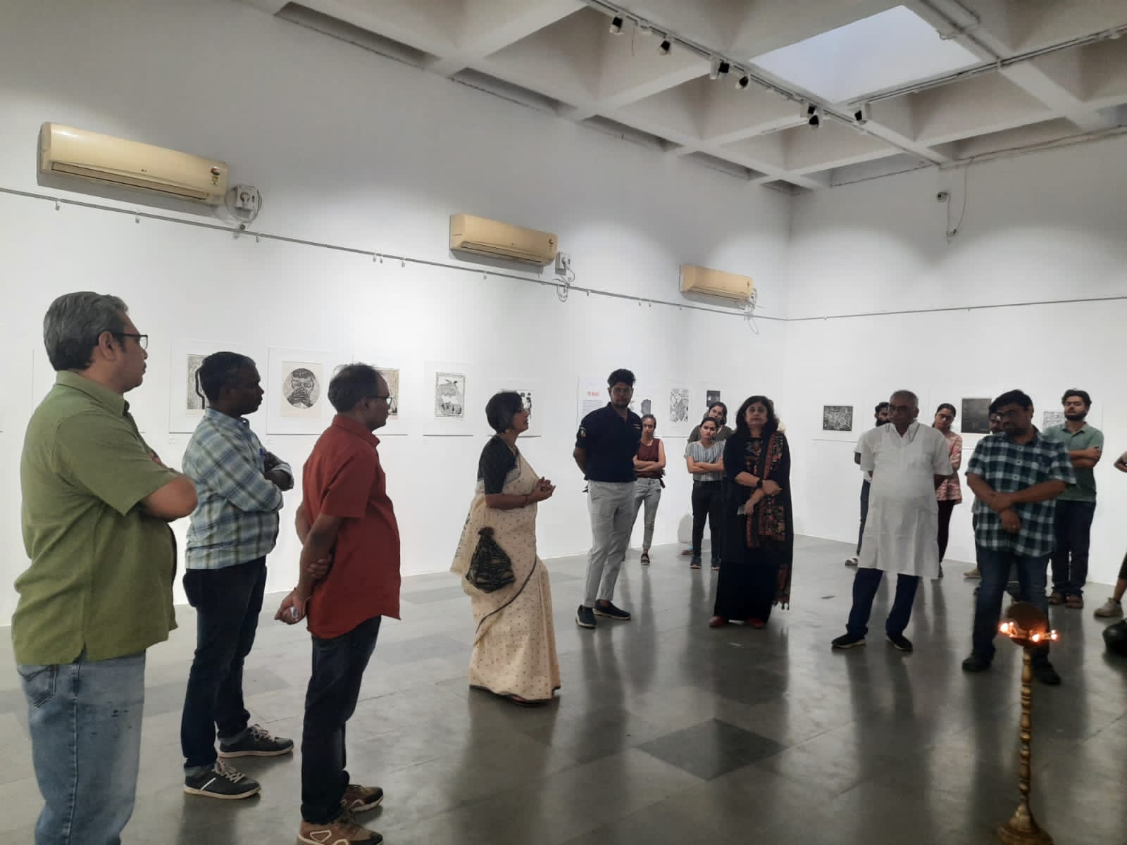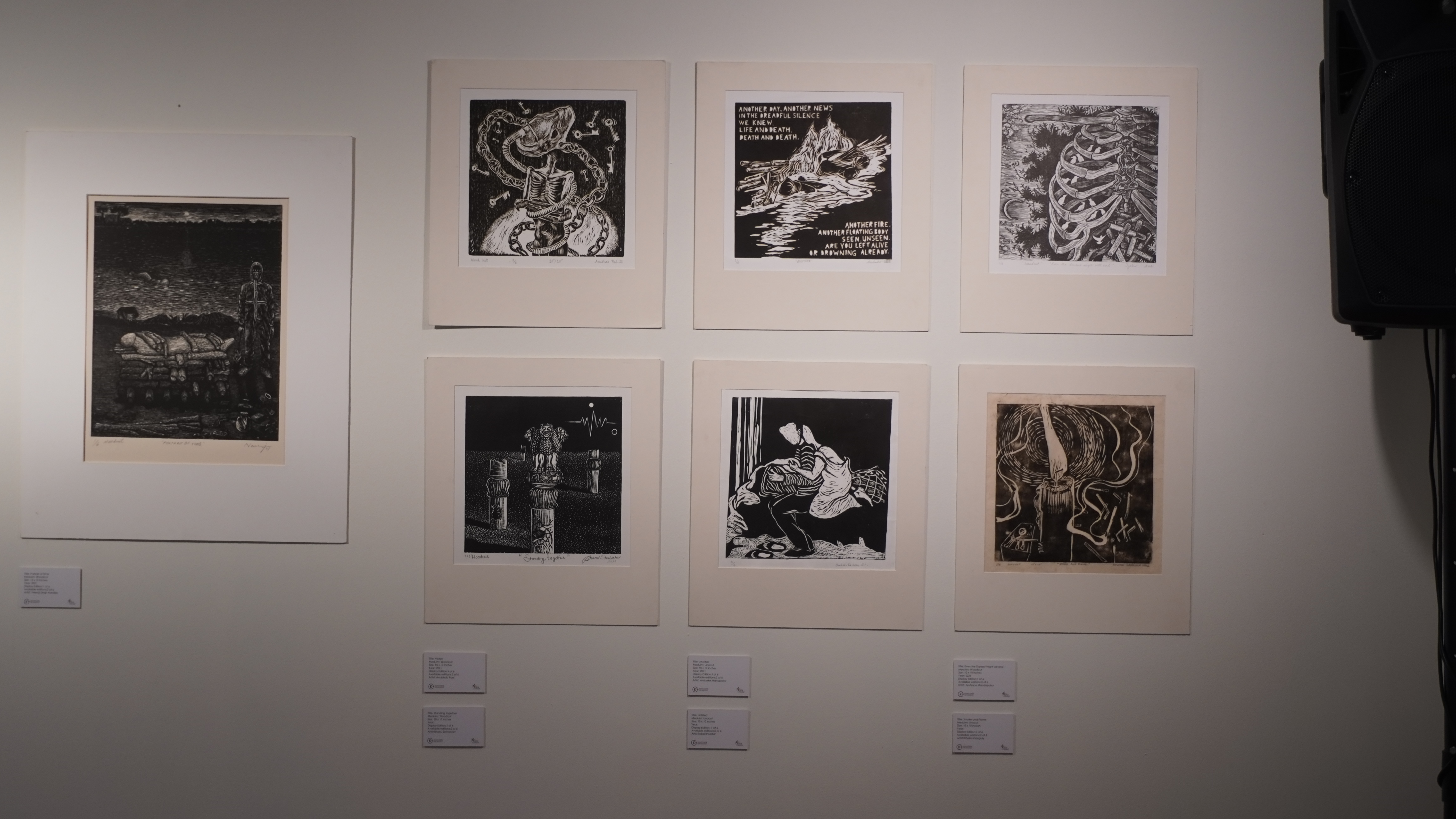 We were excited to showcase this large body of black and white relief prints at the birthplace of modern Indian printmaking, Santiniketan. The exhibition opened at Arthshila Santiniketan. The opening was well attended by faculty members and students from Kala Bhavana,Visva Bharati, as well as other members of the Santiniketan community. People were delighted to see such a large body of prints. Many also commented that the exhibition showcased several works of considerable merit. Some visitors were so moved that they shared their own COVID stories, as at other iterations of the exhibition. Our curator, Dr. Paula Sengupta, also gave a small introductory talk and guided people through the project website.