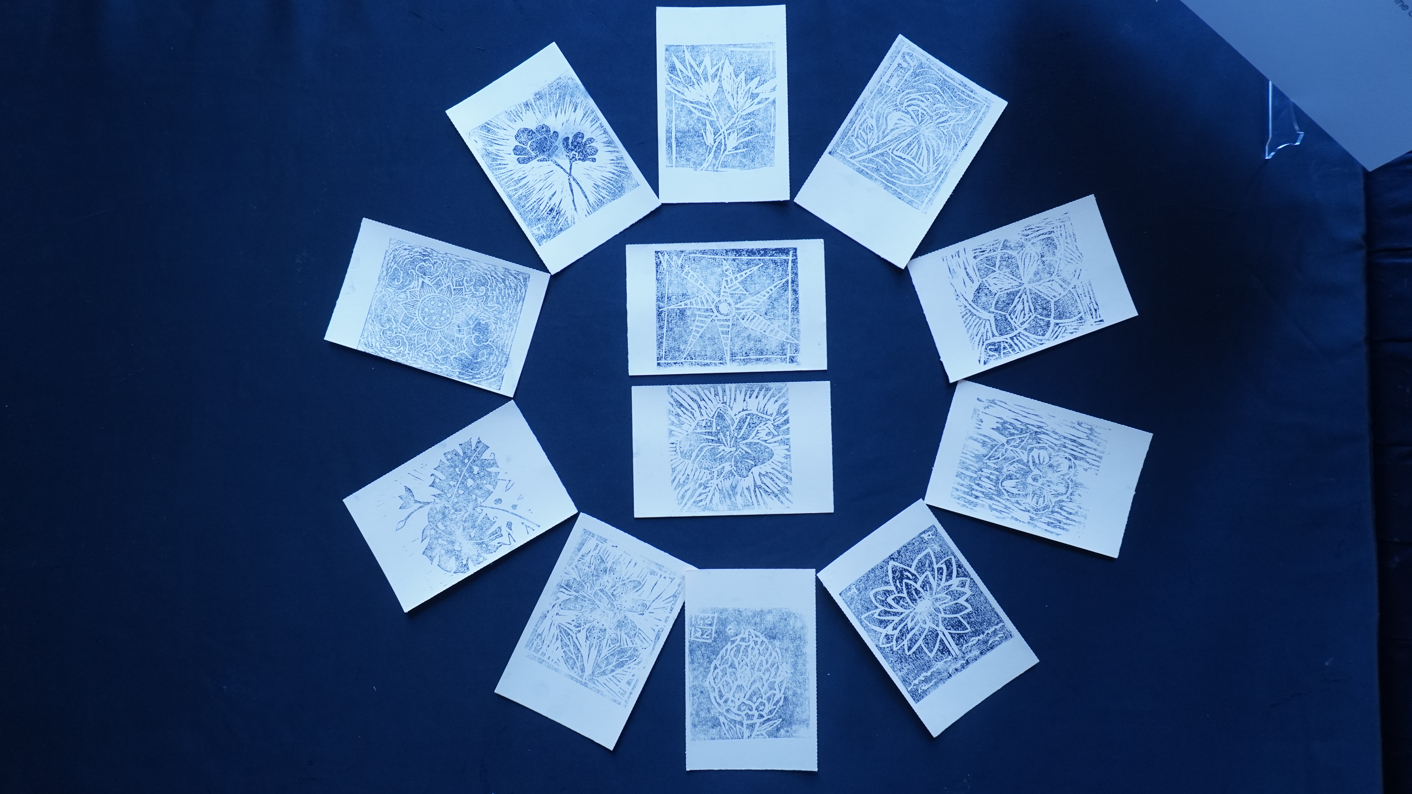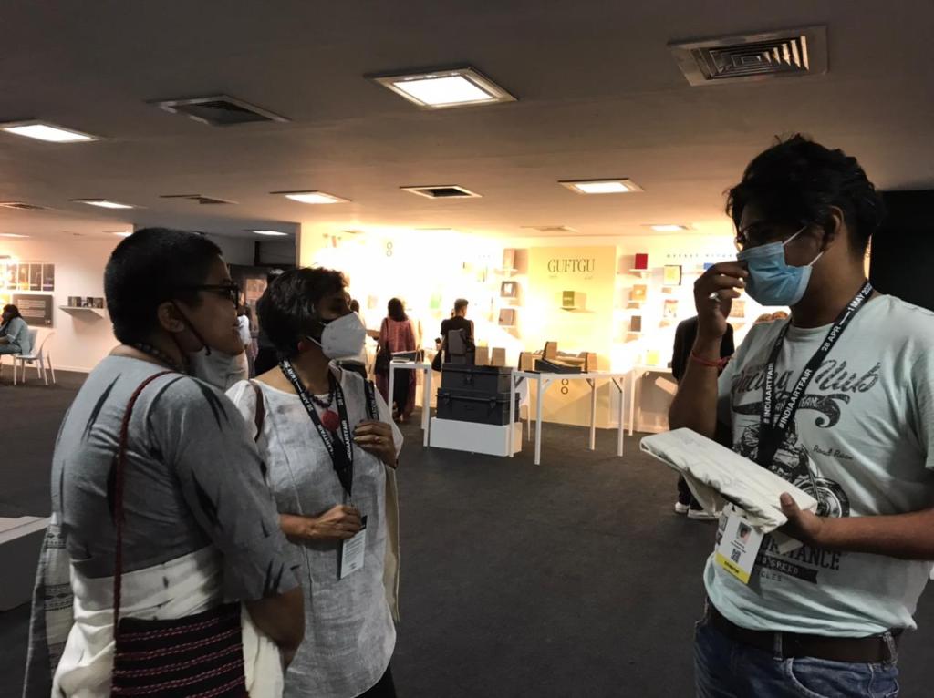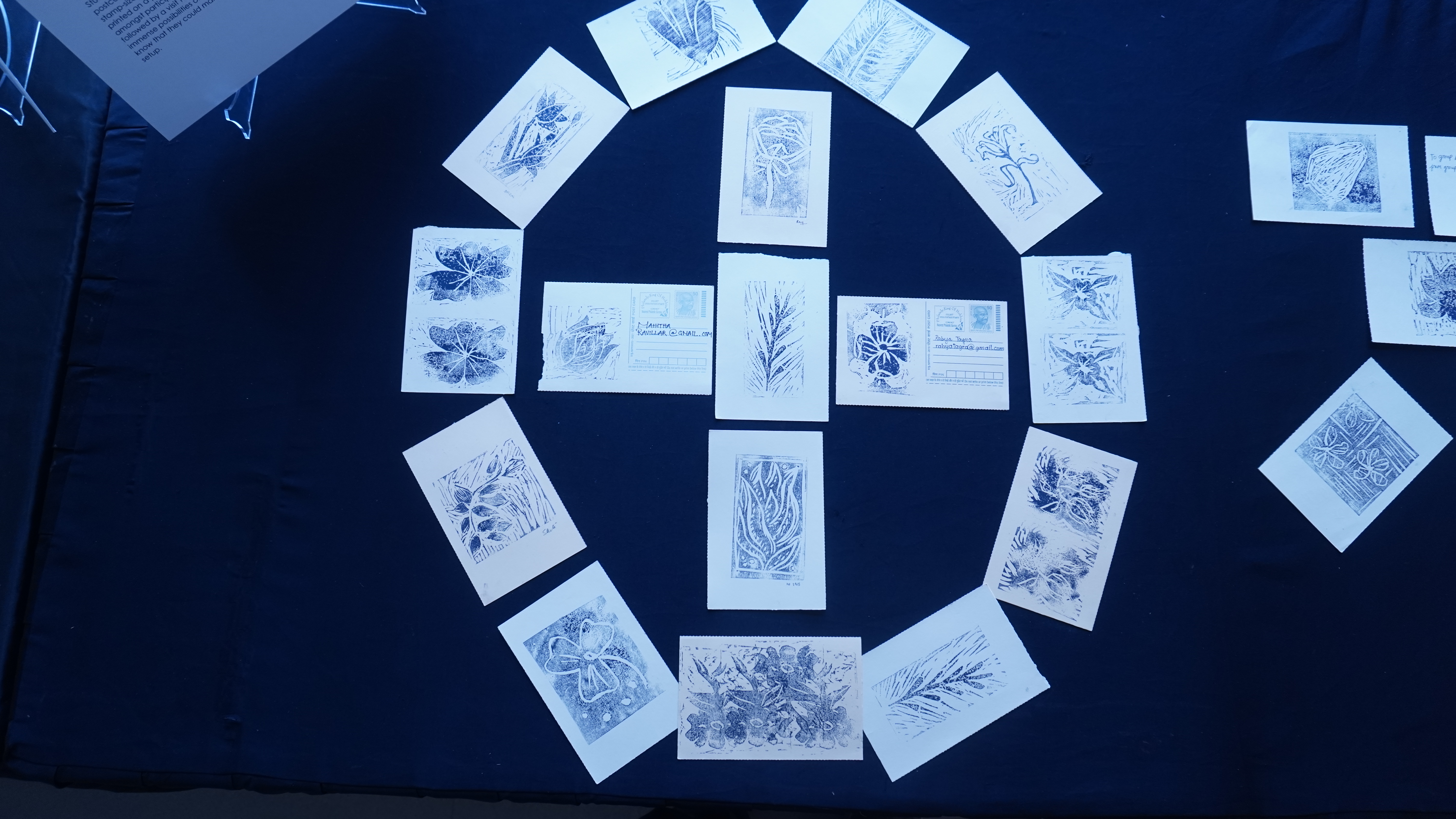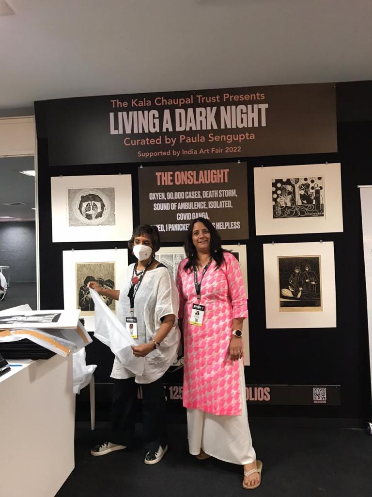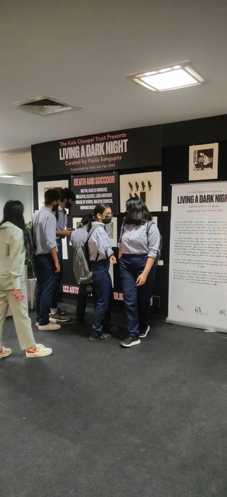 The second iteration of LADN was at the prestigious India Art Fair 2022. Invited to and supported by IAF, we had a small wall and tabletop in the auditorium lobby to display the project. We ran a dynamic display, rotating selected works from the project twice daily to maximise exposure. Being a community project, IAF was the ideal place to engage and interact with visitors, students and fellow artists about their experiences during Covid. It also provided an opportunity to acquaint them with printmaking as an educational tool and a medium for social change.