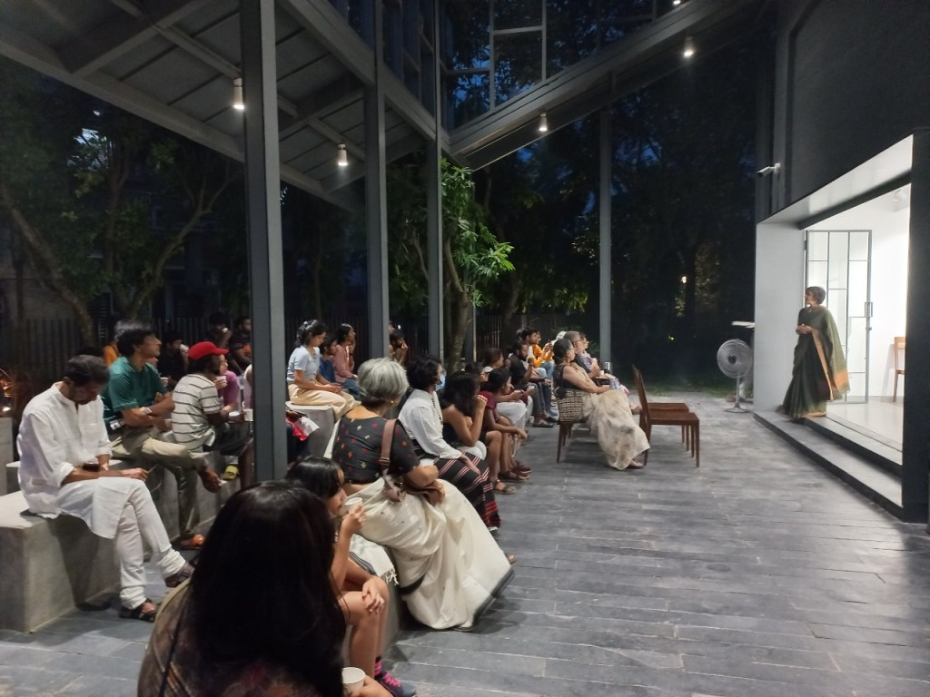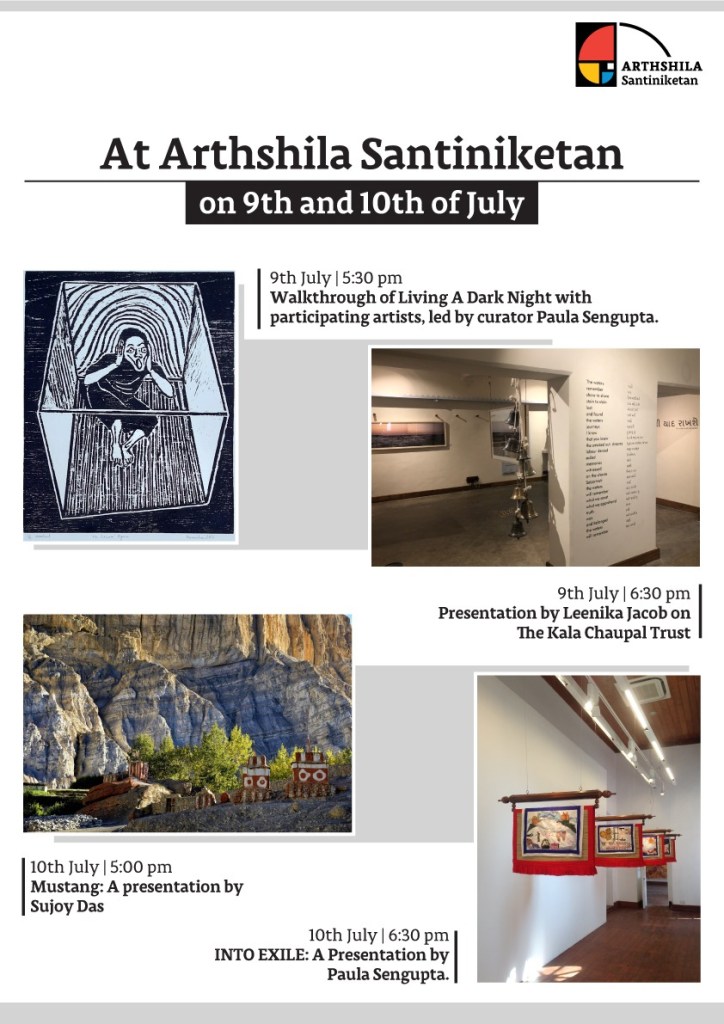 The exhibition concluded with a weekend of events. This included a guided walkthrough of the exhibition by the curator and the LADN artists from West Bengal; a presentation titled “Reclaiming the Cultural Narrative’ by Leenika Jacob, co-founder of The Kala Chaupal Trust; ; a presentation titled “Mustang”by photographer and Himalayan chronicler Sujoy Das; and a presentation titled “Into Exile”by Paula Sengupta.