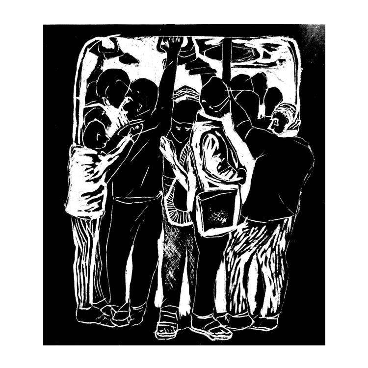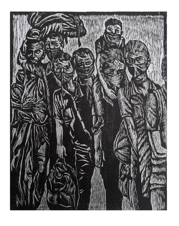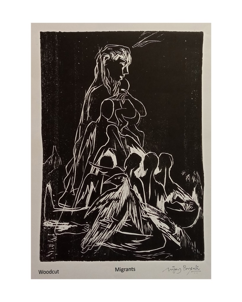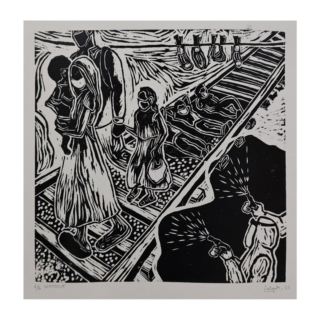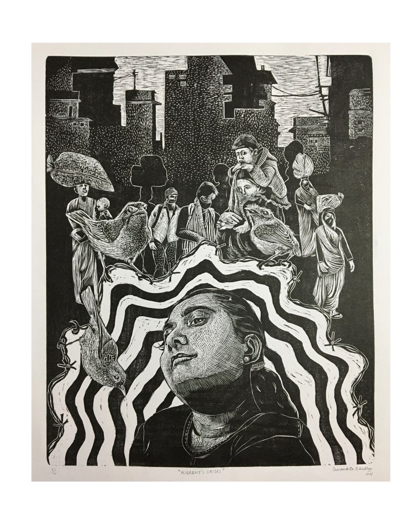 Sunandita Bandhu, ‘Migrant’s Crisis’, woodcut, 12” x 15”