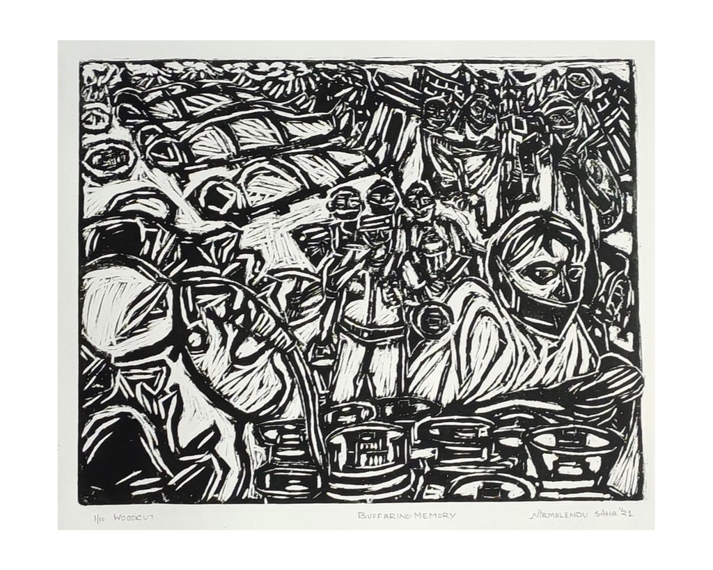 Nirmalendu Saha, ‘Buffering Memory’, woodcut, 15” x 12”