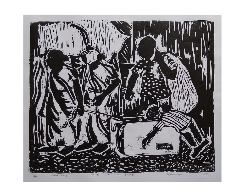 Obayya Manjalpadupu, ‘The Sleeping Child’, woodcut, 15” x 12”