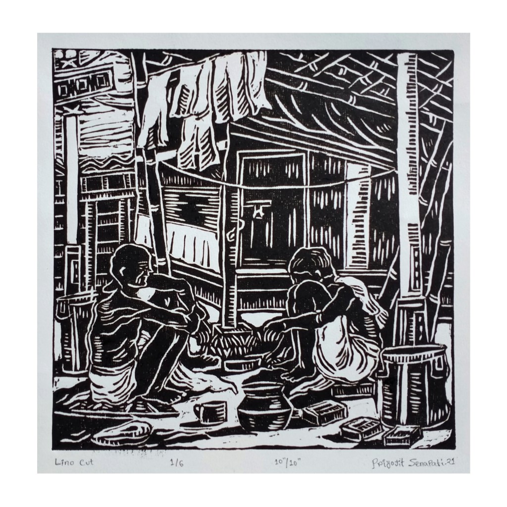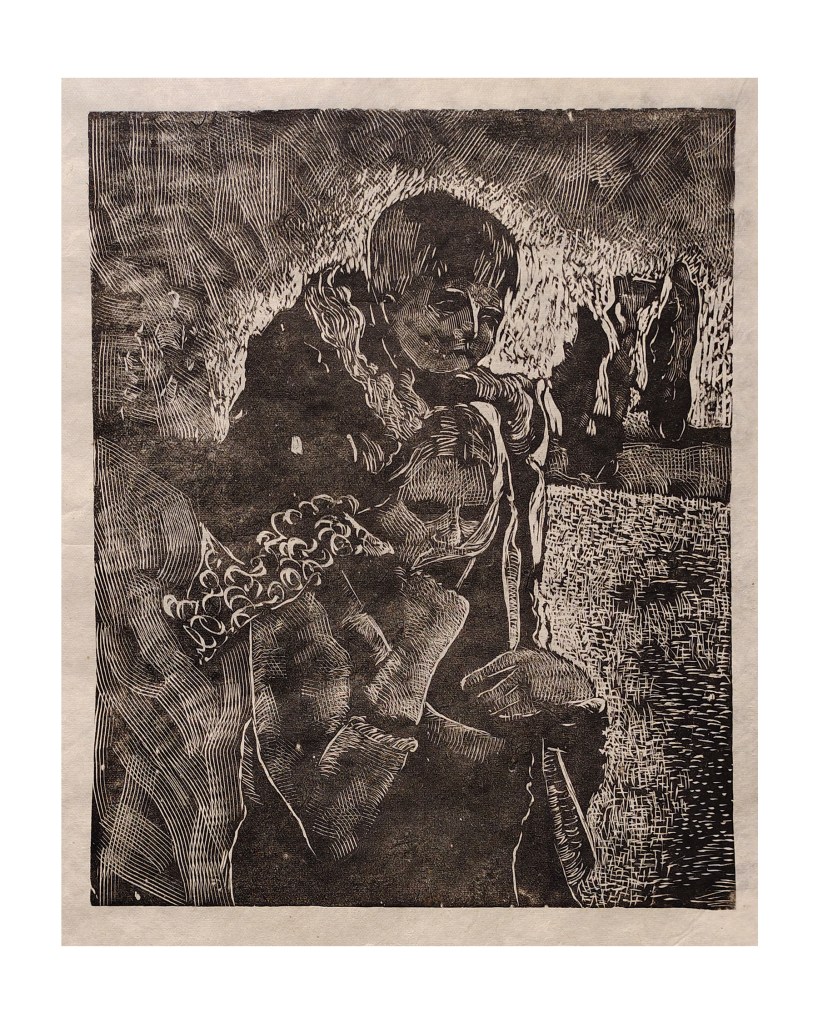 Priyojit Senapati, ‘Misery for situation’, linocut, 12” x 12”