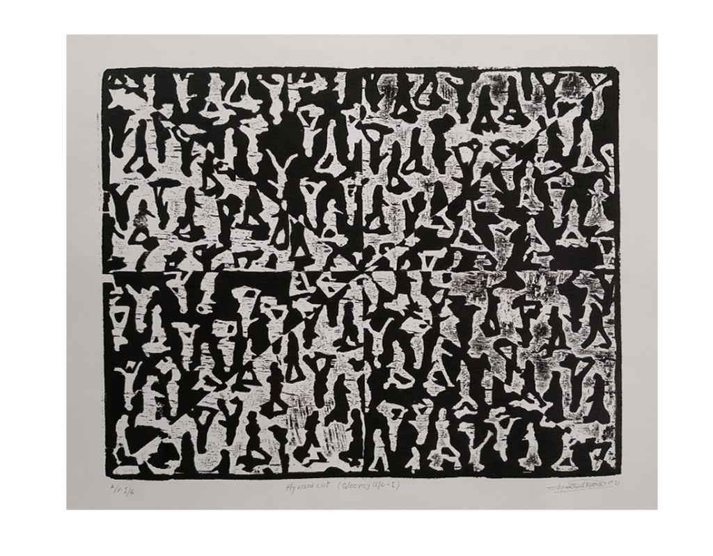 I explore the possibility of multiple textures and patterns in my monochromatic works, woodcut being my most preferred medium to work in. Through my prints, I display the raw emotions and the stimuli they emanate from. Similarly, in “Inevitable Reality”, I’ve have depicted the struggles of a migrant labourer. This narrative is a representation of the submerged thoughts and emotions that crop up inside a distressed mind. The body language displays the ongoing melancholia within his mind. With the emergence of the pandemic and decreasing work opportunities, there is no choice left for him to leave for his native place along with other people like him. With such drastic turn of events and little to no proper management, what else can one do?