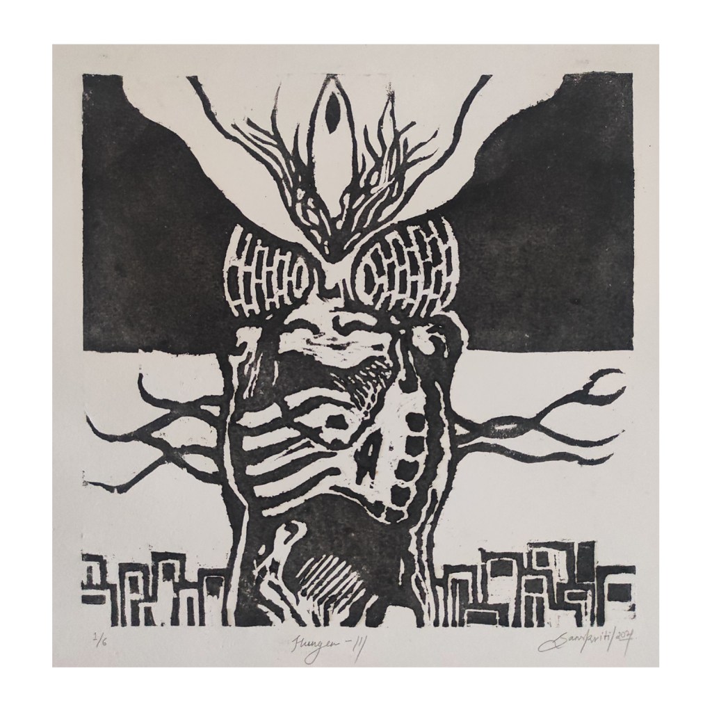 Sanskriti Awasthi, ‘Hunger-III’, woodcut, 12” x 12”