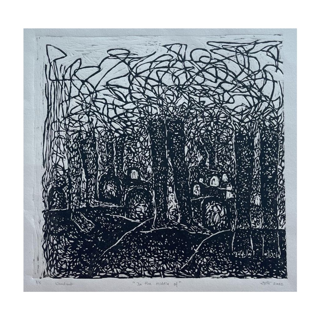 Srishti Gupta, ‘In the Middle of’, woodcut, 12” x 12”