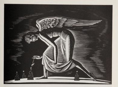 Printmaker Werner Drewes executed someabstract views of America in black and white woodcut after migrating there in 1930. Another German-born illustrator, cartoonist, and printmaker, Fritz Eichenberg (1901-1990), was forced to flee Germany by the Nazis in 1933. He began his career as an illustrator and political cartoonist for the Federal Art Project after immigrating to America. His approach to wood engraving was realistic, with extraordinary implementation of graphic chiaroscuro.