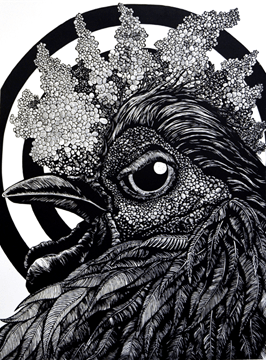 Other contemporary printmakers working and researching in the realm of black and white relief printmaking were Tom Huck, Jun Lee, Johanna Mueller. Tom Hunk is best known for his large scale satirical woodcuts in black and white. Taking inspiration from Albrecht Durer and Jose Guadalupe Posada, Hunk constructed incredibly thin networks of lines, incorporating a denser middle tone than ever before. Johanna Mueller takes a step further to improve the environment by substituting environmentally friendly plastic sheets for woodblocks. Her engraving on plastic is intricately detailed, gouging networks of lines in various orientations to distinguish musculature, objects, and surfaces. June Lee’s black and white relief prints explore the hardship and struggle of the living world. Her black and white woodcuts are rendered in wonderful detail and graphic chiaroscuro.