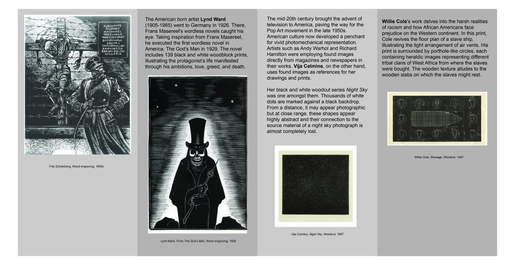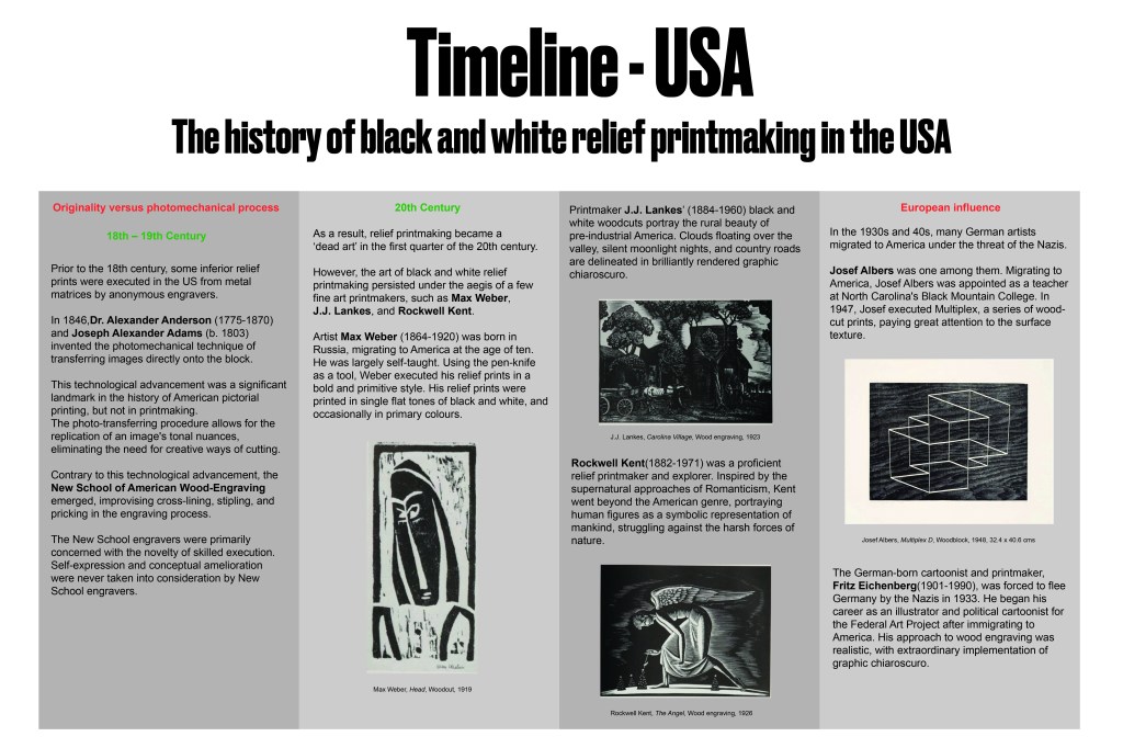 Being a British colony, America adopted Thomas Bewick’s schooling in relief printmaking. Black and white relief printmaking was employed primarily for commercial illustration, but was not necessarily the favoured choice for artistic enterprise in the US. Few printmakers, such as Rockwell Kent and J.J. Lankes, executed in black and white relief printmaking with exceptional academic proficiency. Yet their prints were confined to illustrations, with no explicit attempt at conceptual development and stylisation. Black and white relief printmaking developed in America during the first quarter of the 20th century with artists migrating from Europe. Finally, by the latter half of the 20th century, post-Modern artists had successfully articulated black and white relief printmaking practice in the context of American culture and history.